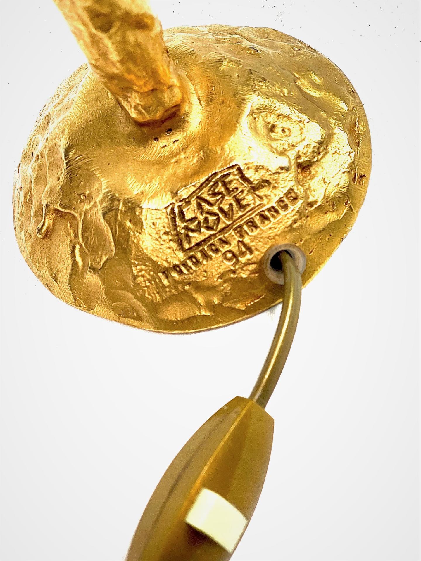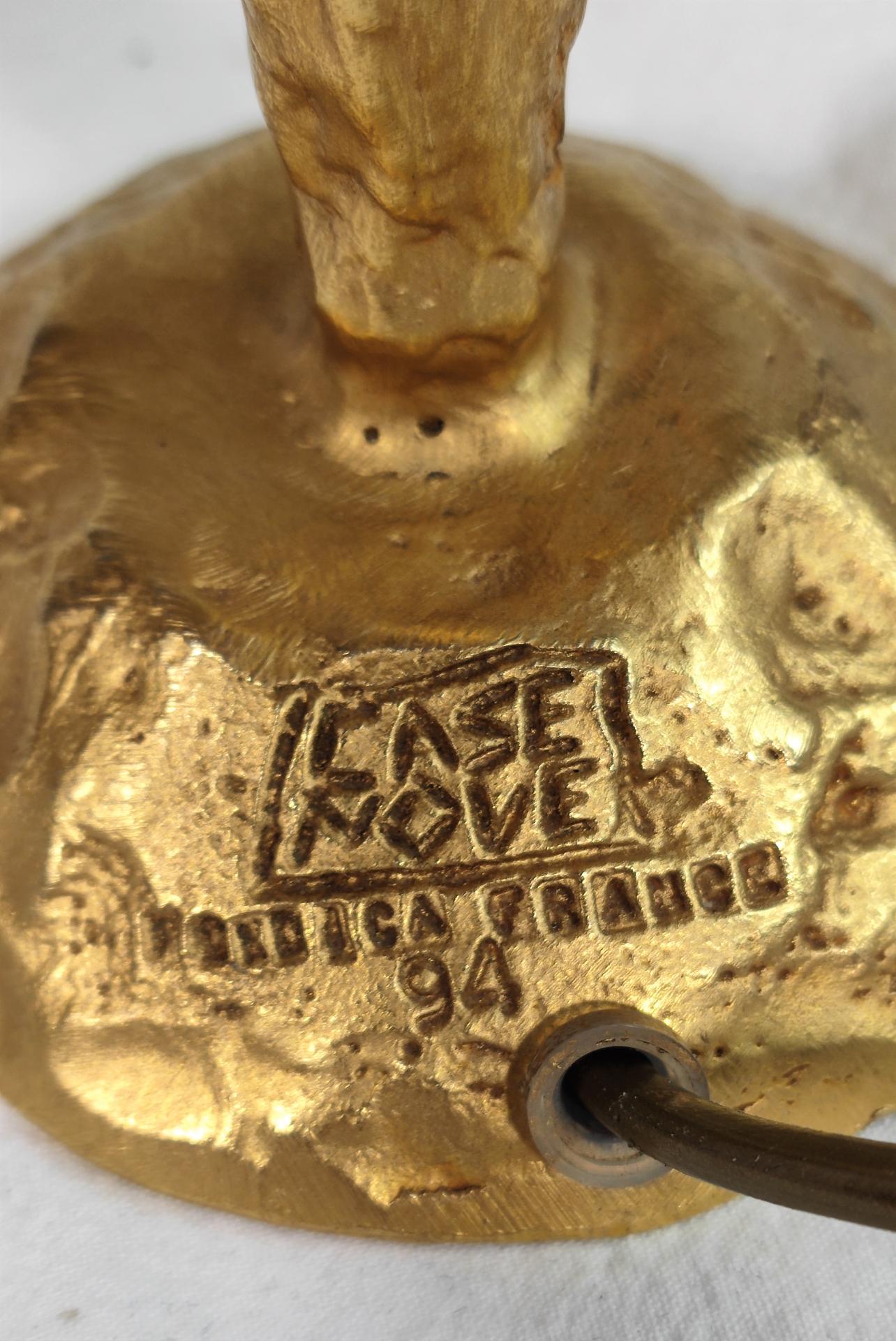 LARGE AND ELEGANT BRONZE LAMP BASE, hammered effect and golden patina, signed at the base, circa 1990. Bulb: B22
