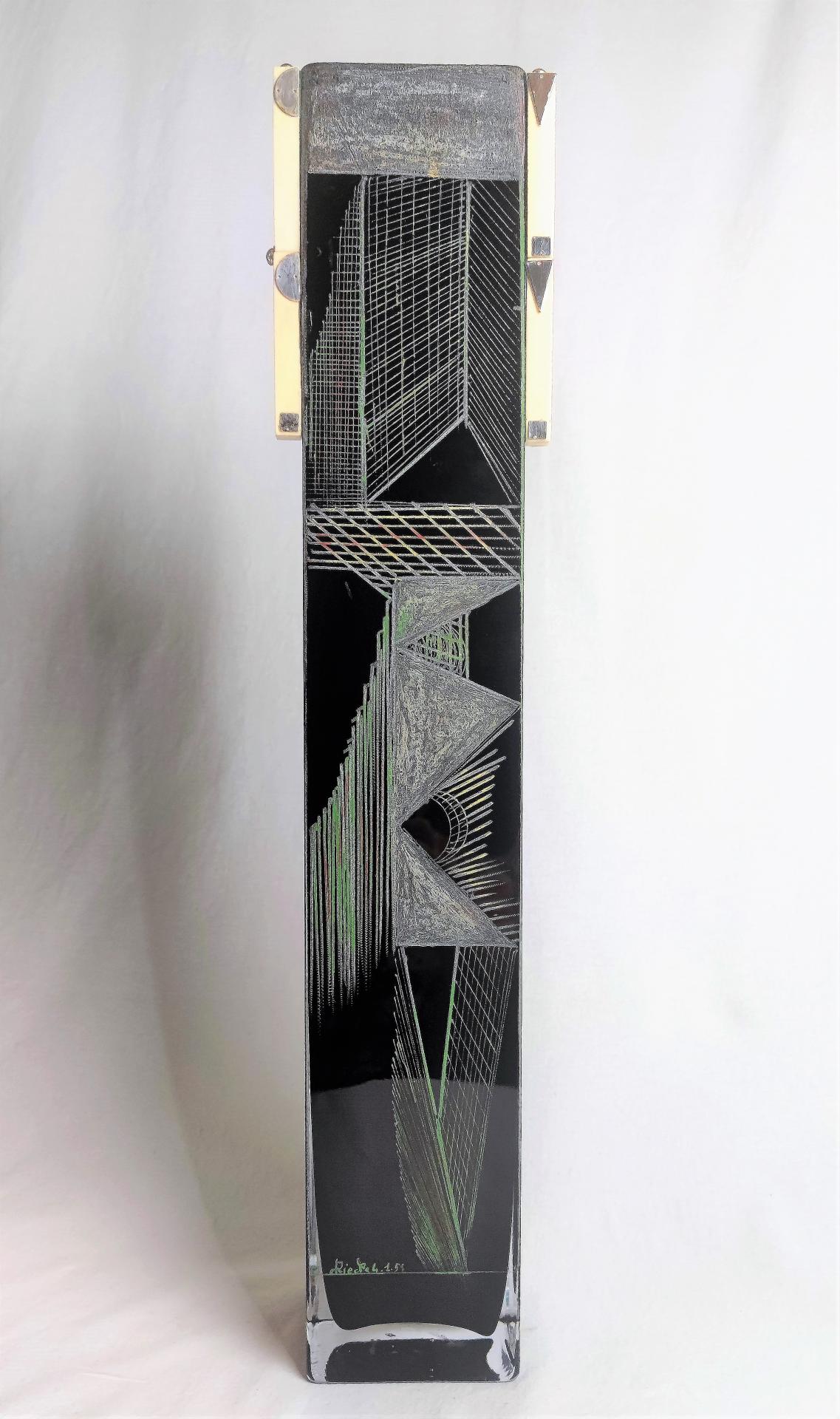 Haut vase de A. RIECKE, (60 cm) à section carrée en verre coloré noir, à décor géométrique dégagé à la meule et rehaussé de pastel , application de barrettes  sur les deux cotés.