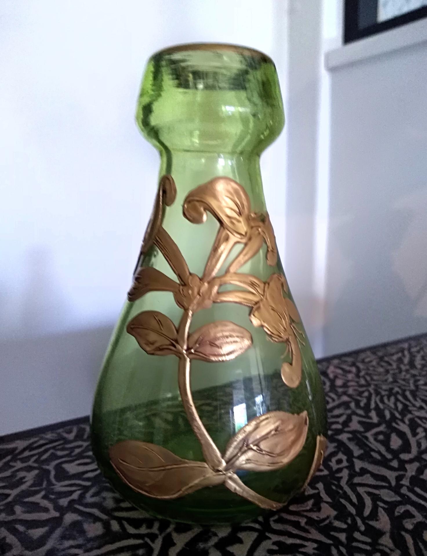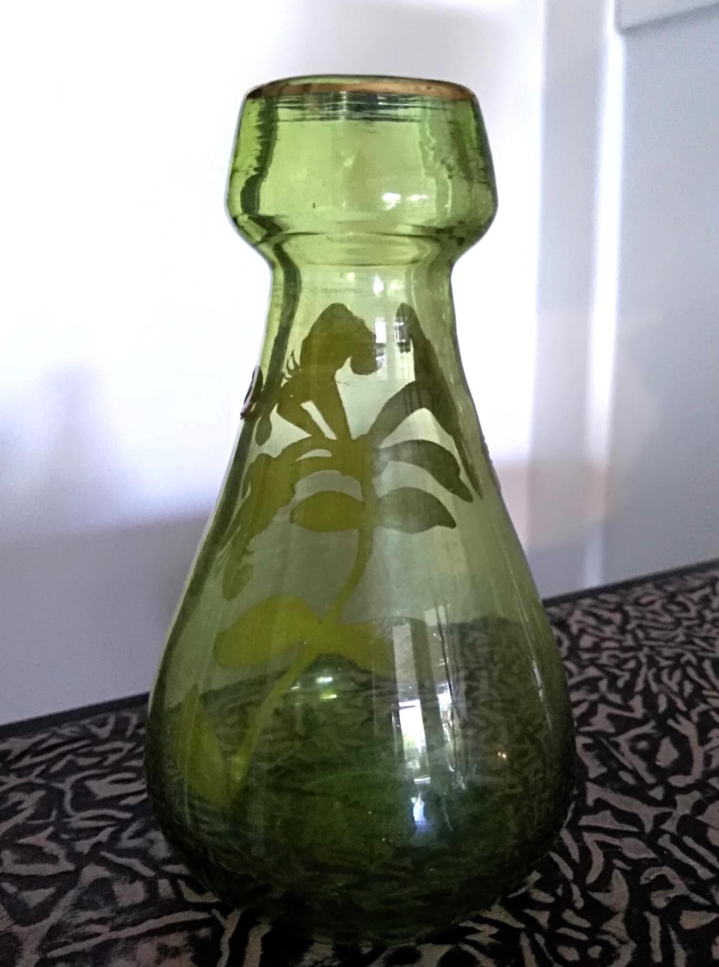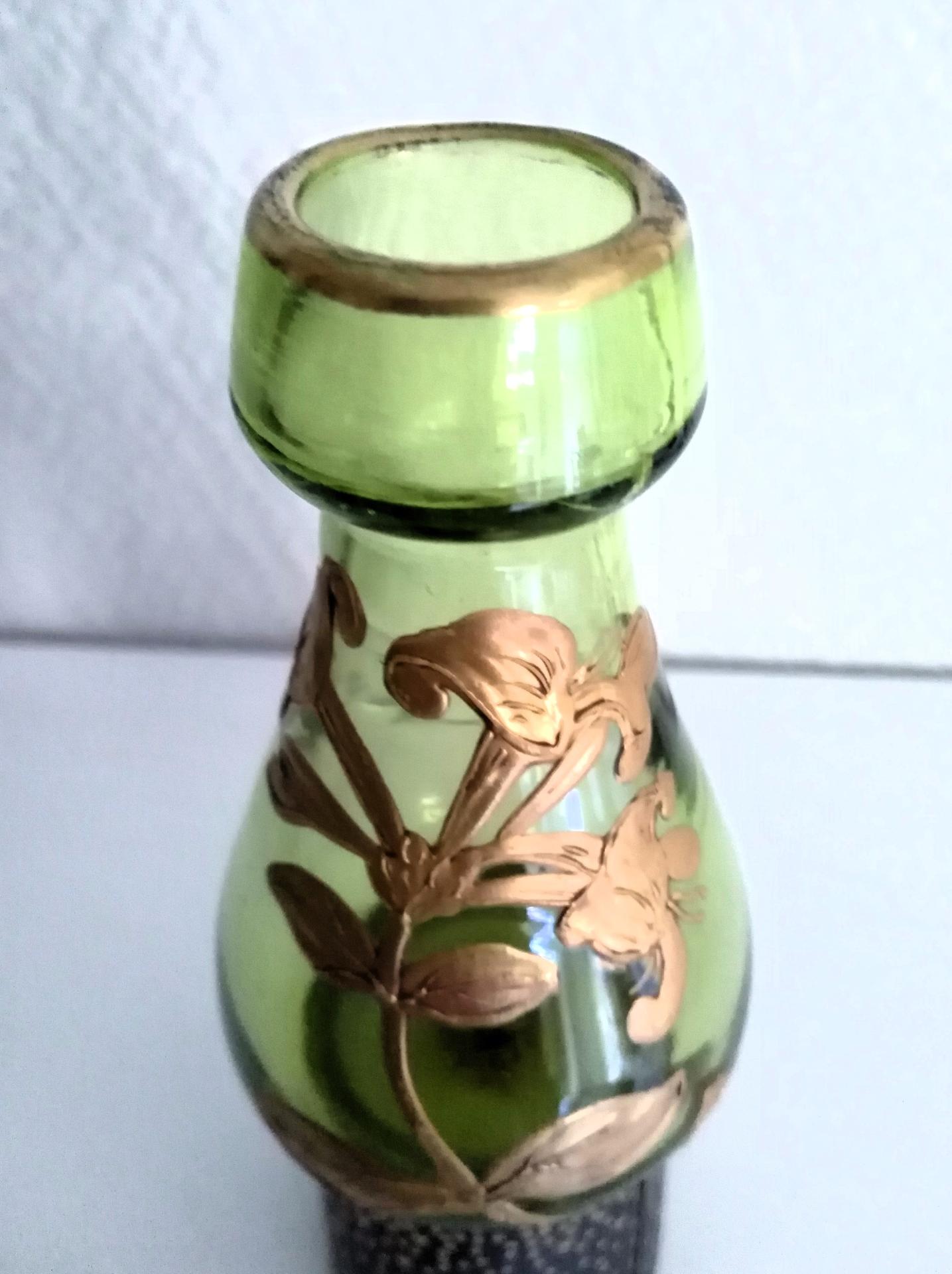 Old miniature « art nouveau » vase MontJoye, Legras St Denis, green, with enameled gilding decoration of flowers and foliage, late 19th century – early 20th century