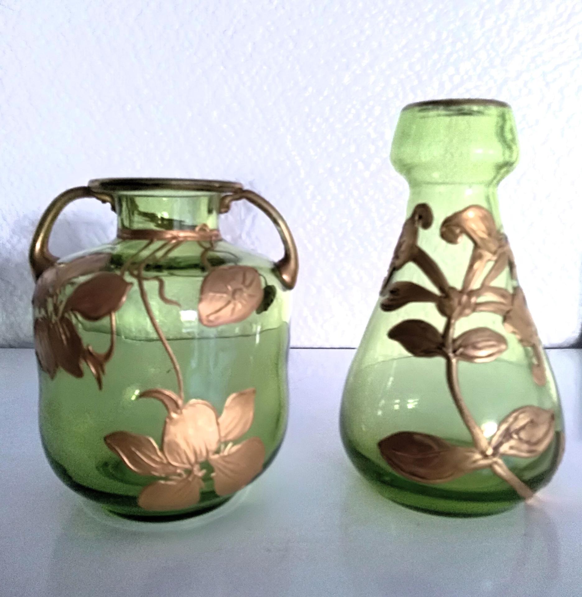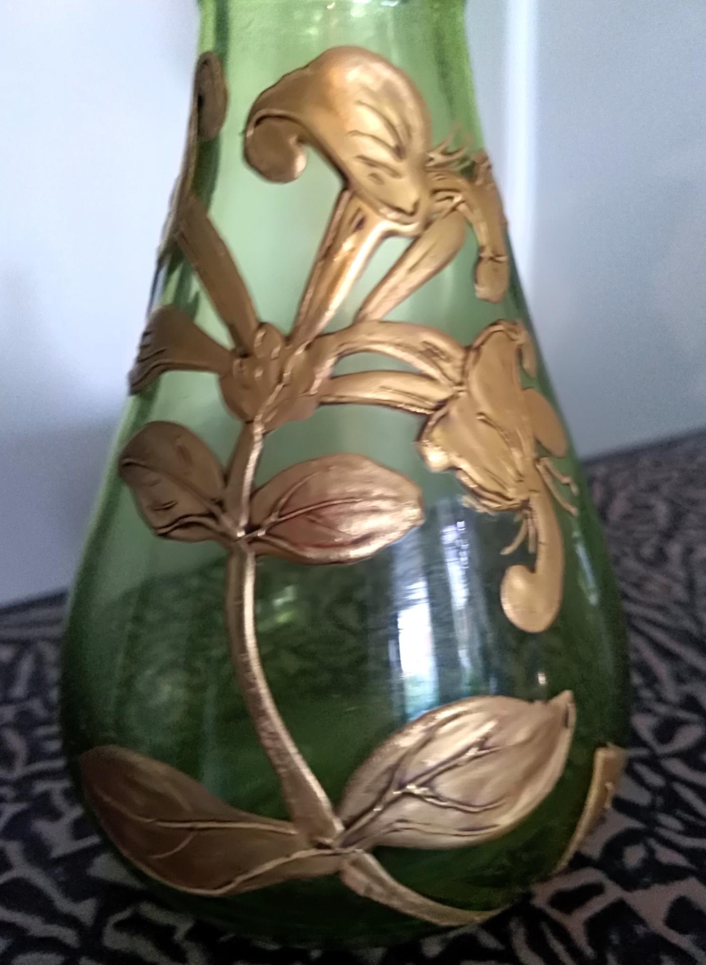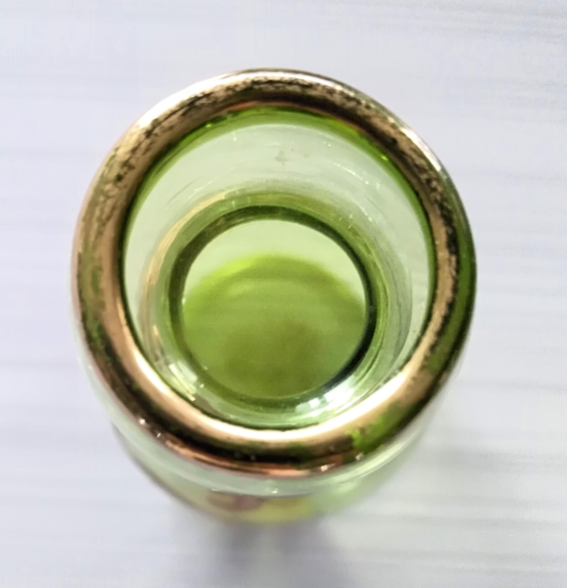 Old miniature « art nouveau » vase MontJoye, Legras St Denis, green, with enameled gilding decoration of flowers and foliage, late 19th century – early 20th century