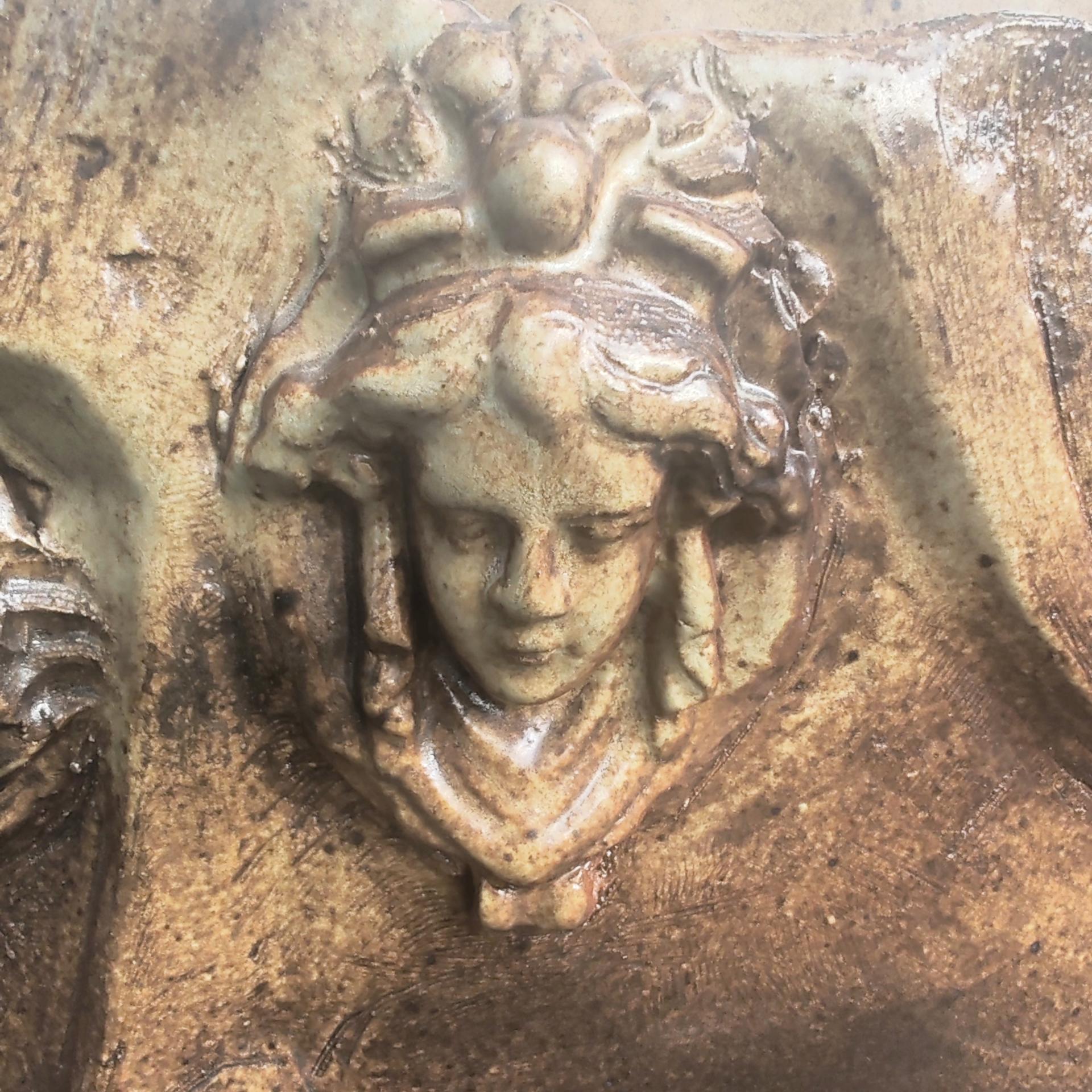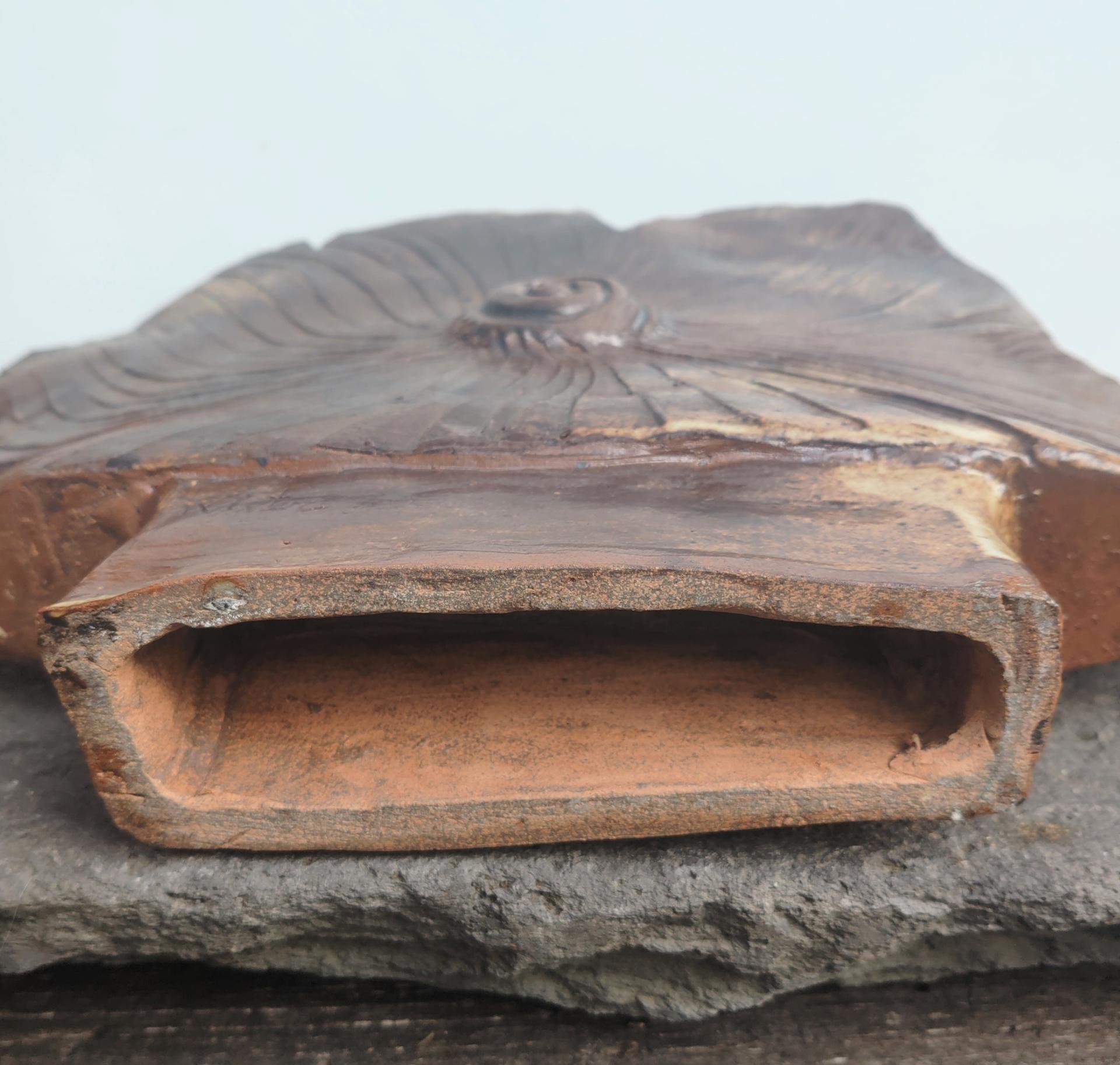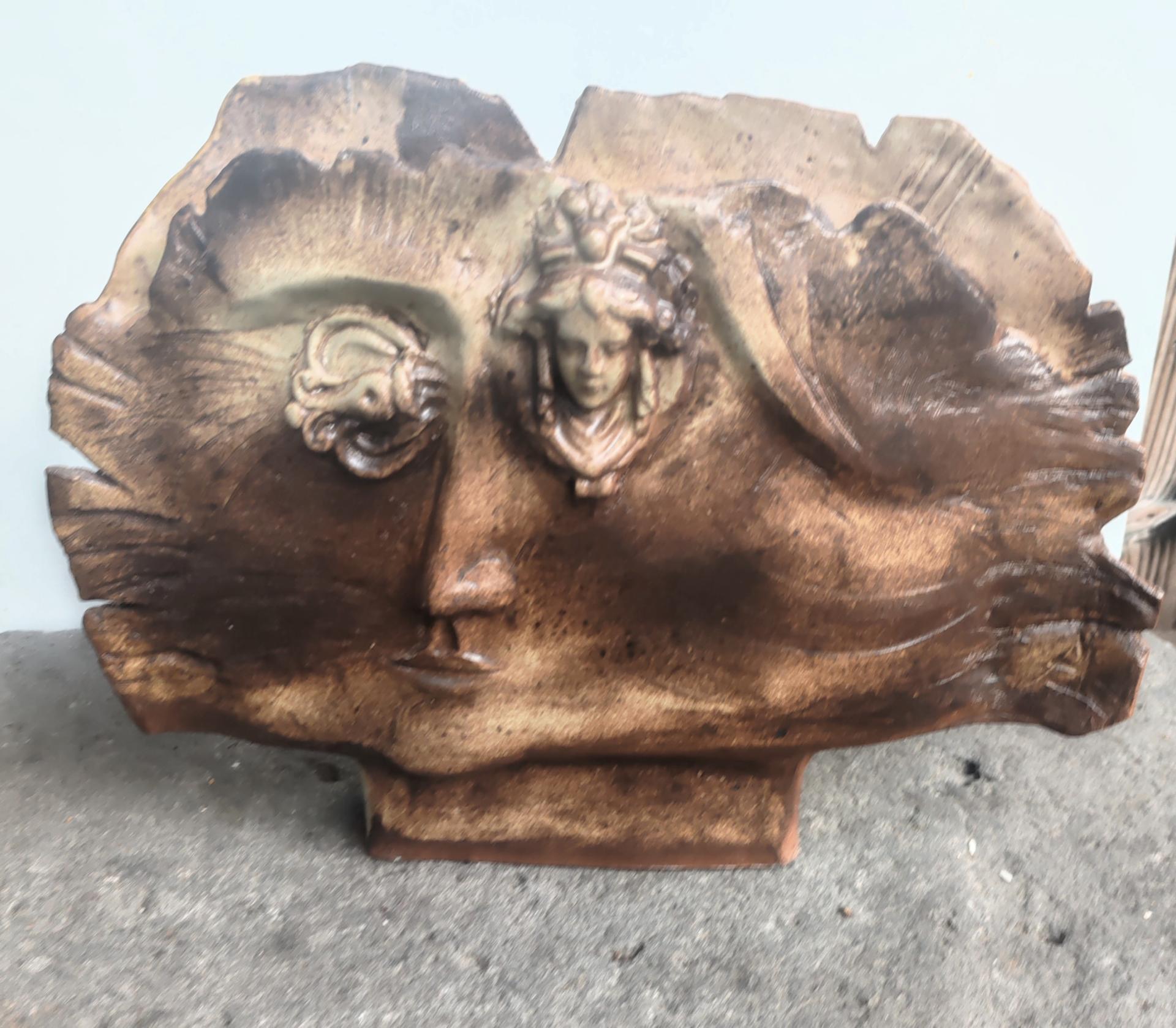 Sur la face principale un autre visage en relief , ainsi qu’un motif esoterique, un nouveau motif  au dos, peut être un astre
