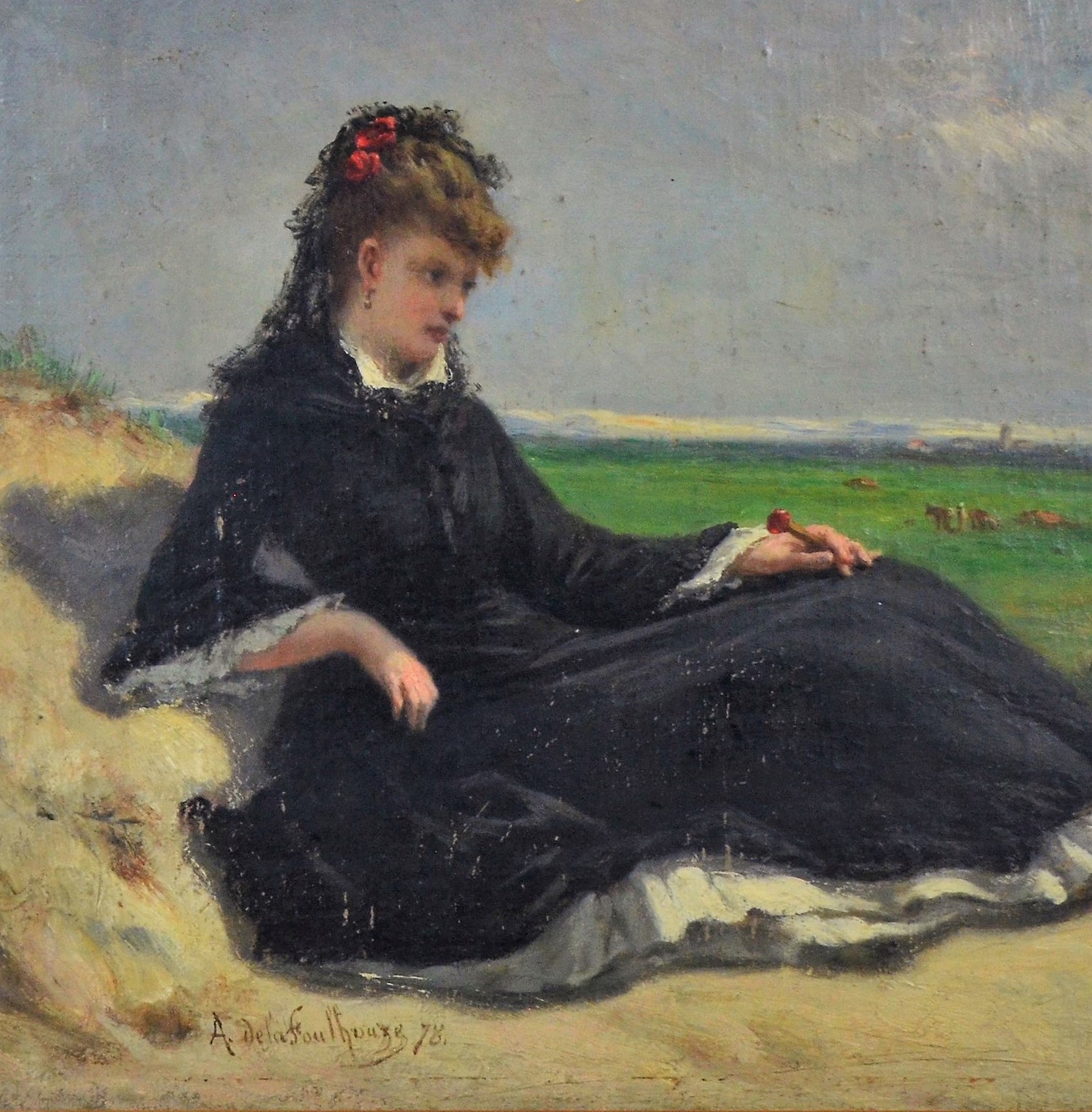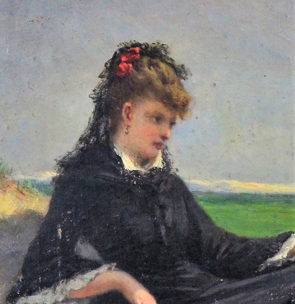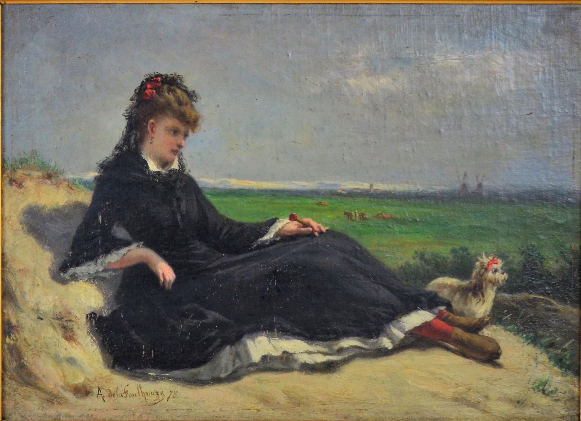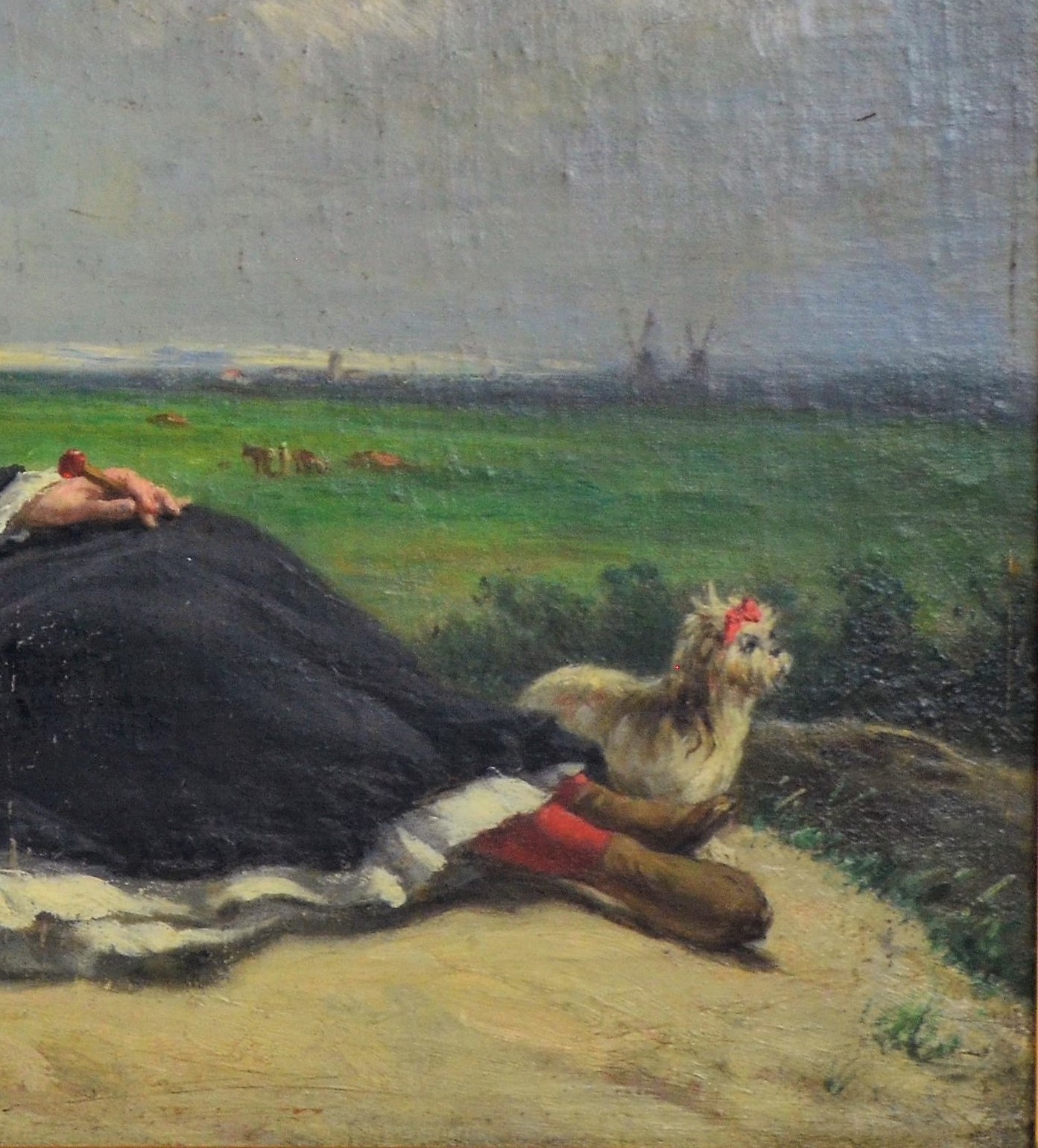 Représentant une femme en costume et coiffure d’époque assise sur un rocher, un petit chien à ses pieds, on distingue au fond du tableau ce qui pourrait-être des moulins à vent.