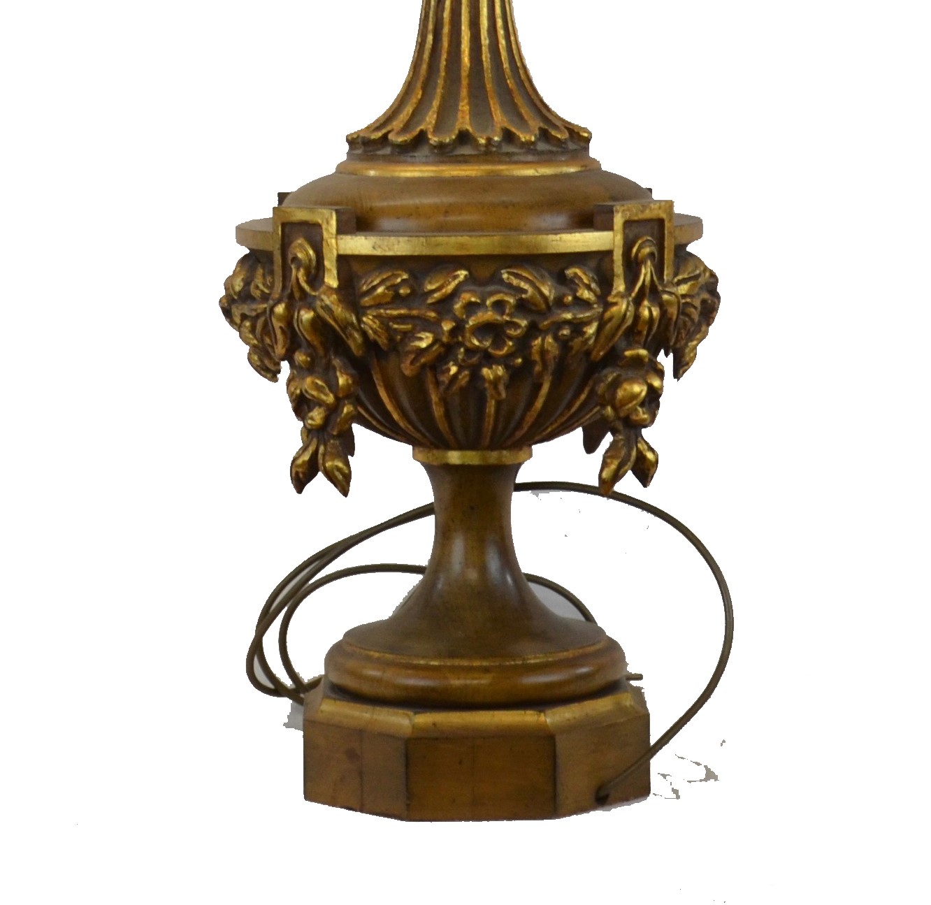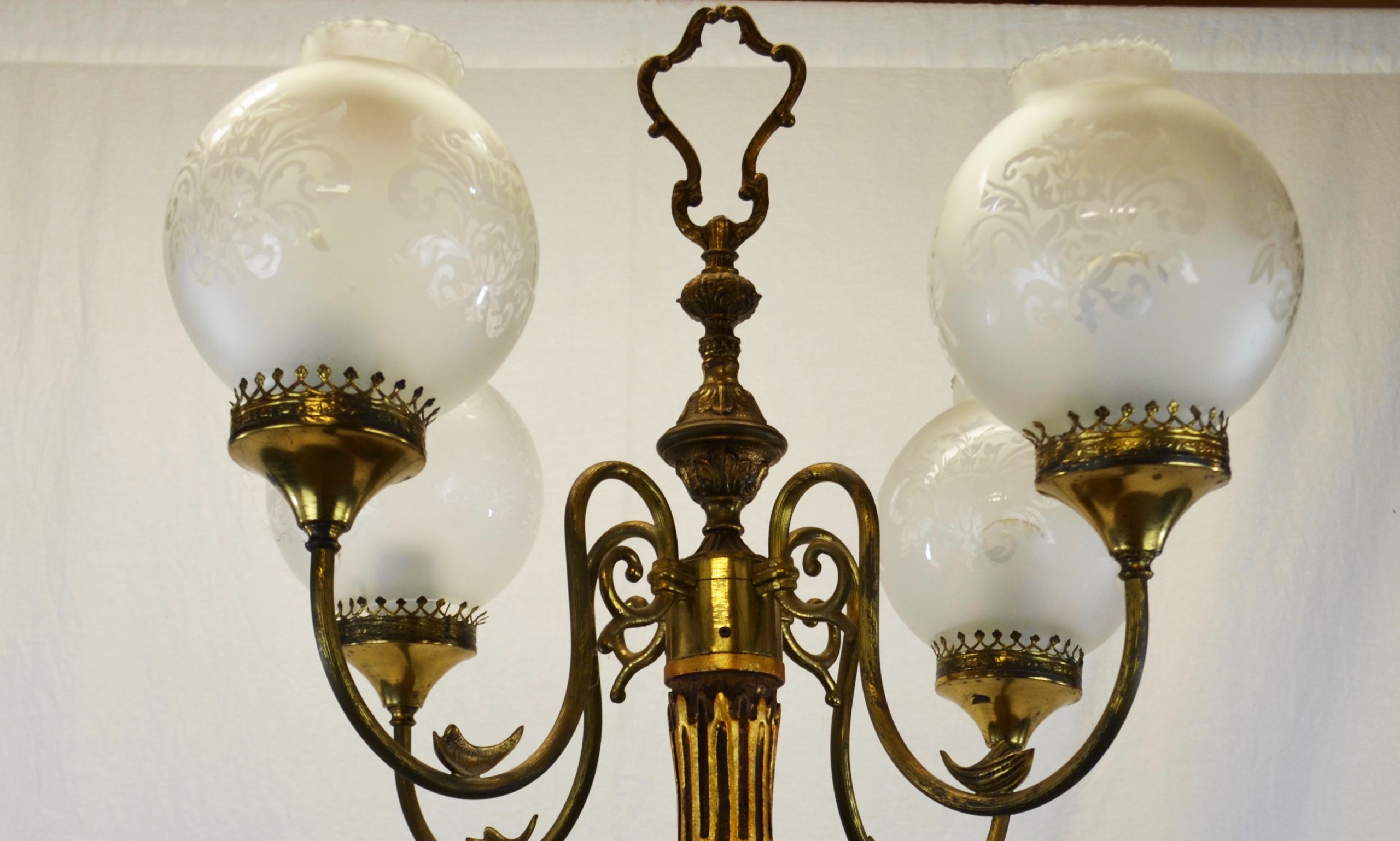 Candélabre en bois doré et bras en laiton. Bel ornement avec 4 globes en verre dépoli à motifs,( un globe a été remplacé) début du XX ème siècle.