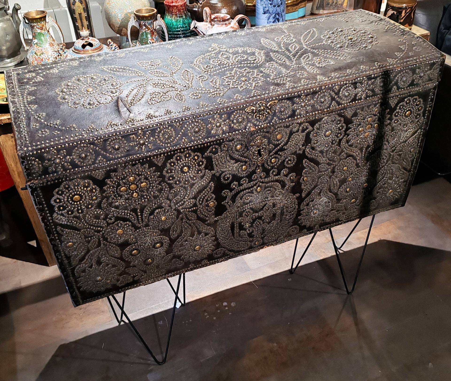 L’utilisation du cuir clouté sur les coffrets, coffres et malles remonte au Moyen-âge. Il assure une certaine étanchéité de la structure en bois et permet un décor plus résistant que l’utilisation de la peinture.
