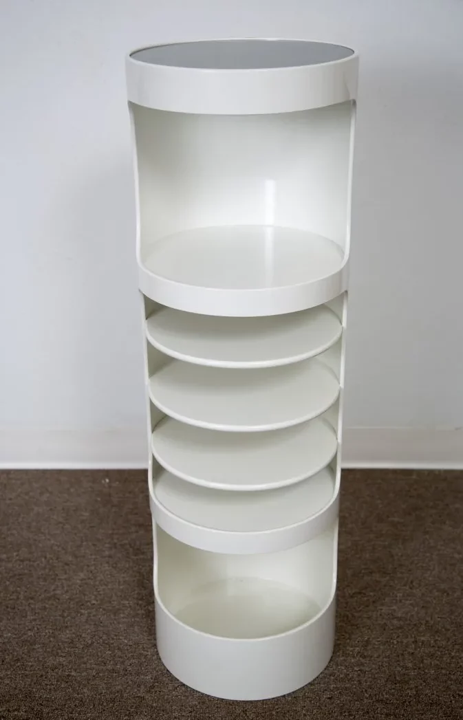 Étagère, modèle  rare, ronde peu encombrante, très pratique, en fibre de verre blanche avec plateau en verre fumé encastré composée de 6 compartiments, convient pour la cuisine, la salle de bain, le bureau ou le studio, dans le style de Joe Columbo ou Kartell