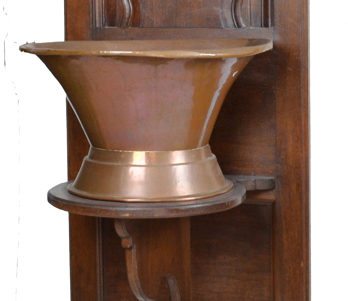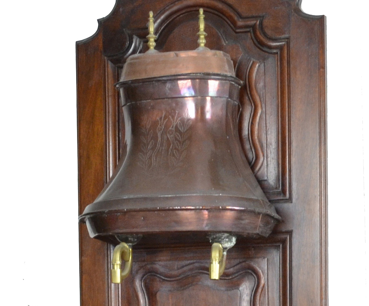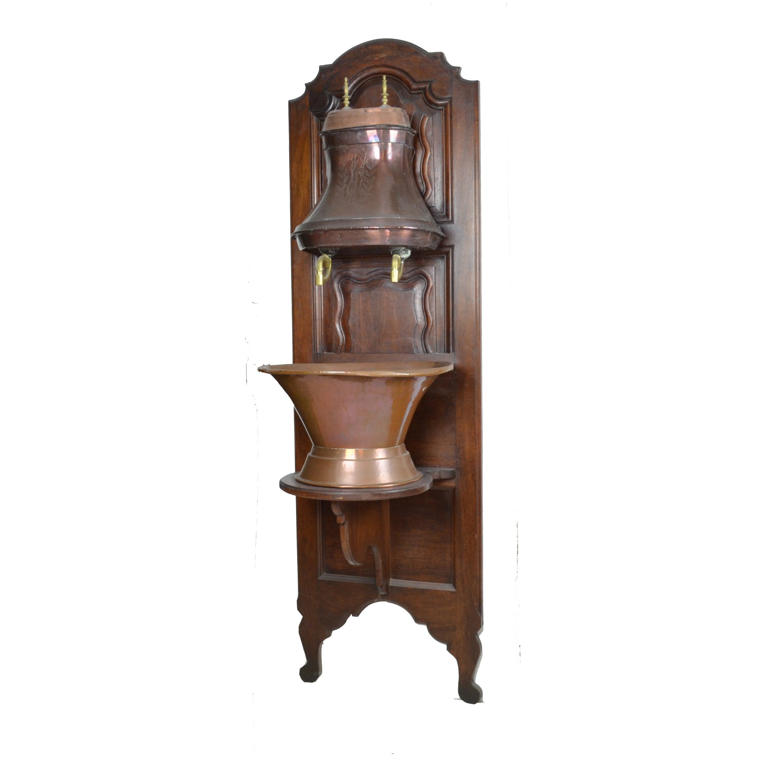 La vogue des fontaines d’intérieur s’est développée au début du XVIIIème siècle, et est une conséquence de l’emploi de la fourchette : au lieu de se laver les mains dans un bassin présenté avec son aiguière entre chaque plat, on le fait avant puis après le repas.