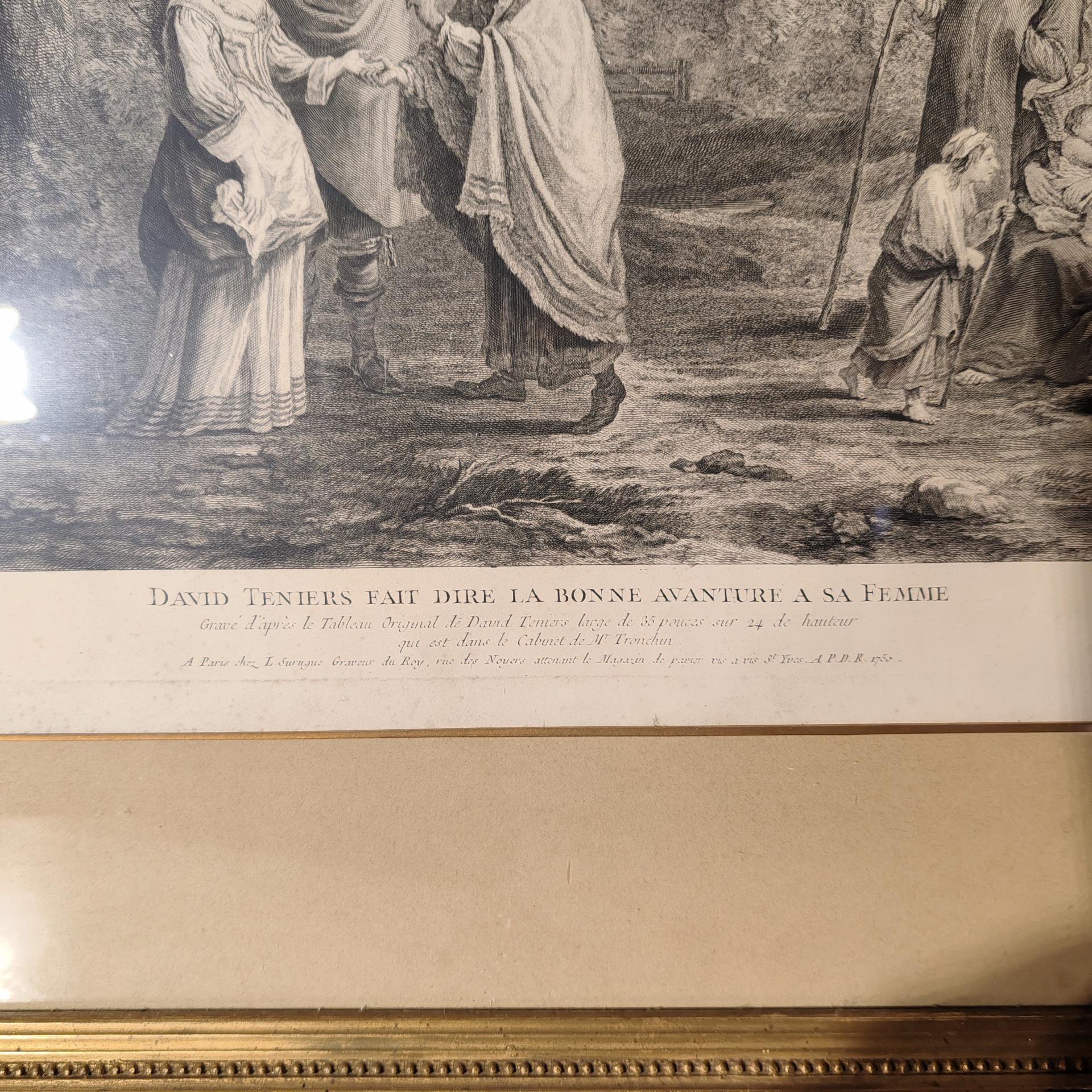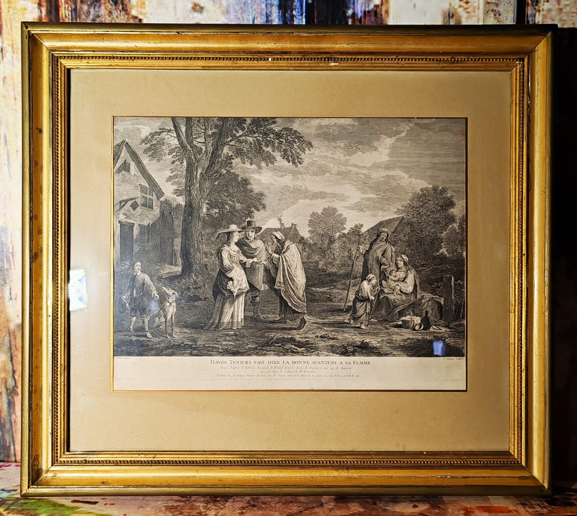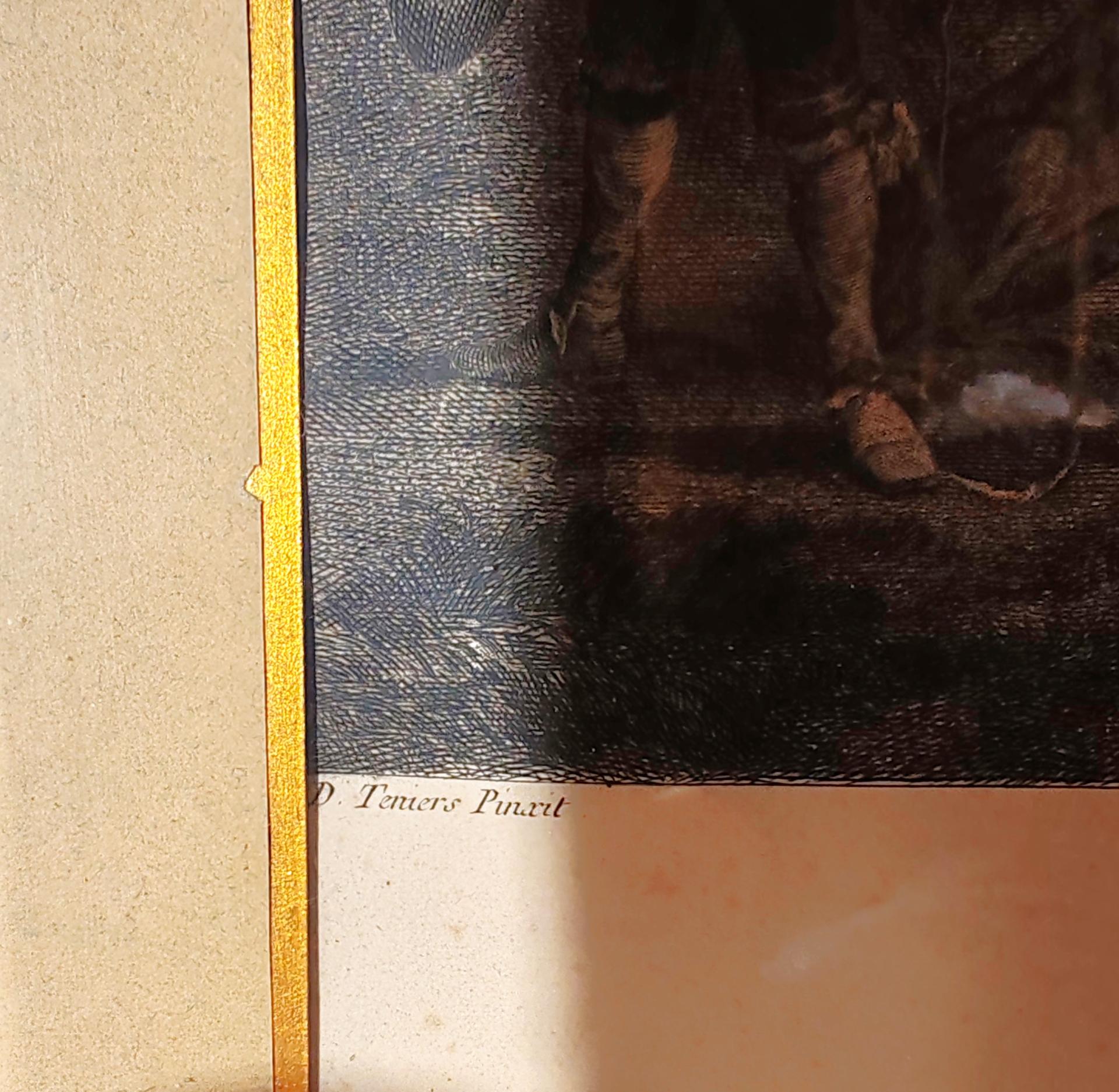 Lettrage en marge inférieure avec titre, noms des producteurs et détails sur la peinture originale : « D. Teniers Pinxit » et « L. Surugue Sculpsit ». et « Gravé d’après le Tableau Original de David Teniers dans le Cabinet de Mr. Tronchin » et « A Paris chez L. Surugue, Graveur du Roy, rue des Noyers attenant le Magazin de papier vis a vis St. Yves. APDR 1750 ».