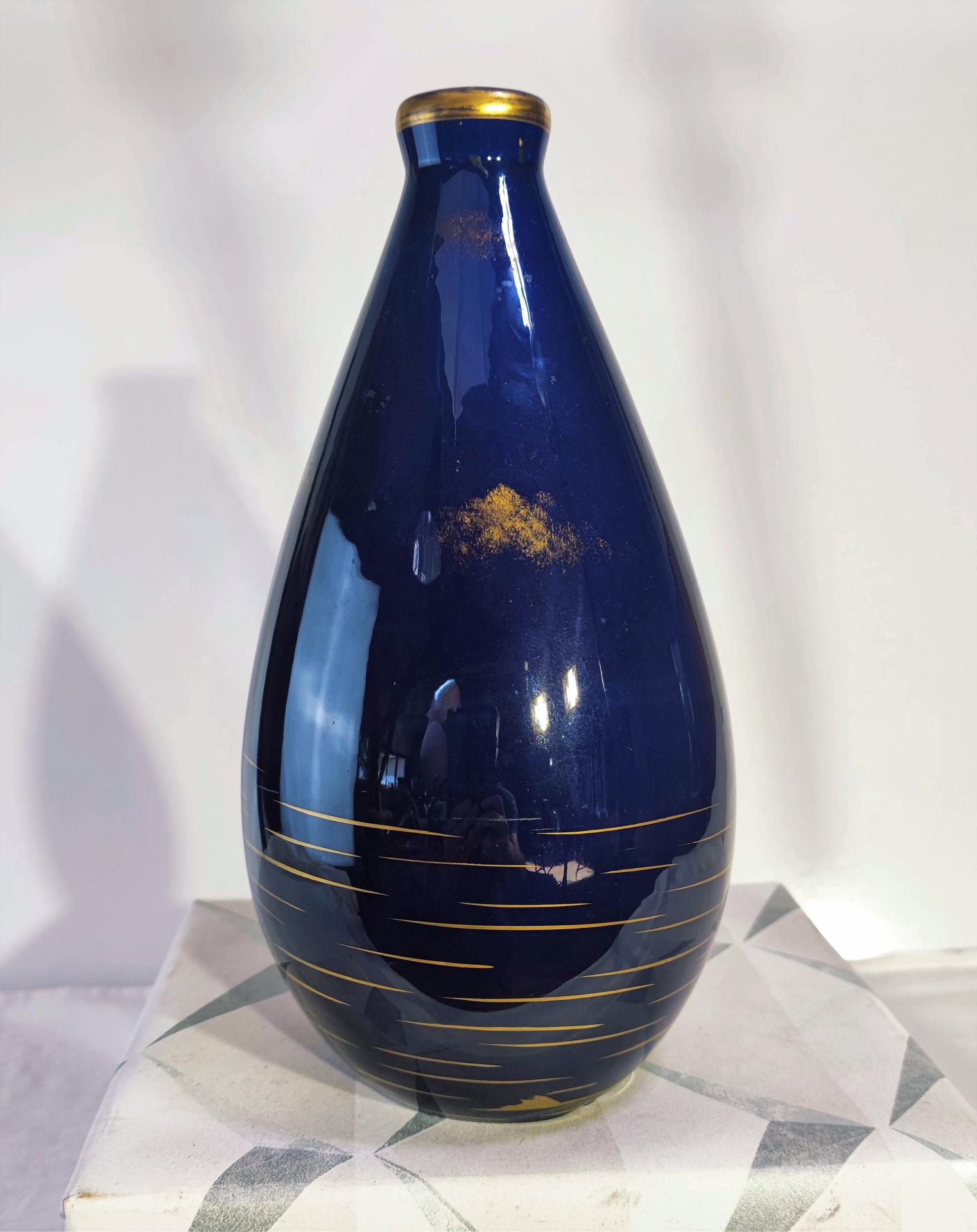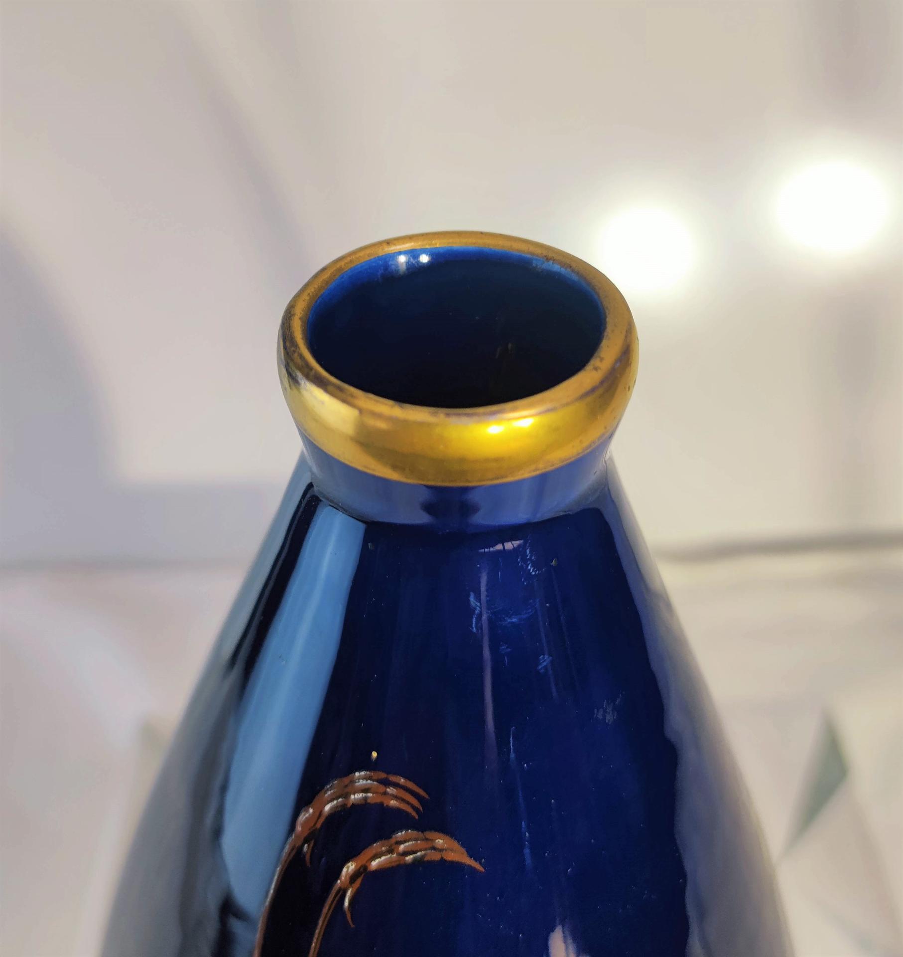 Vase en porcelaine à décor or d’un cygne  sur fond Bleu de Tours.