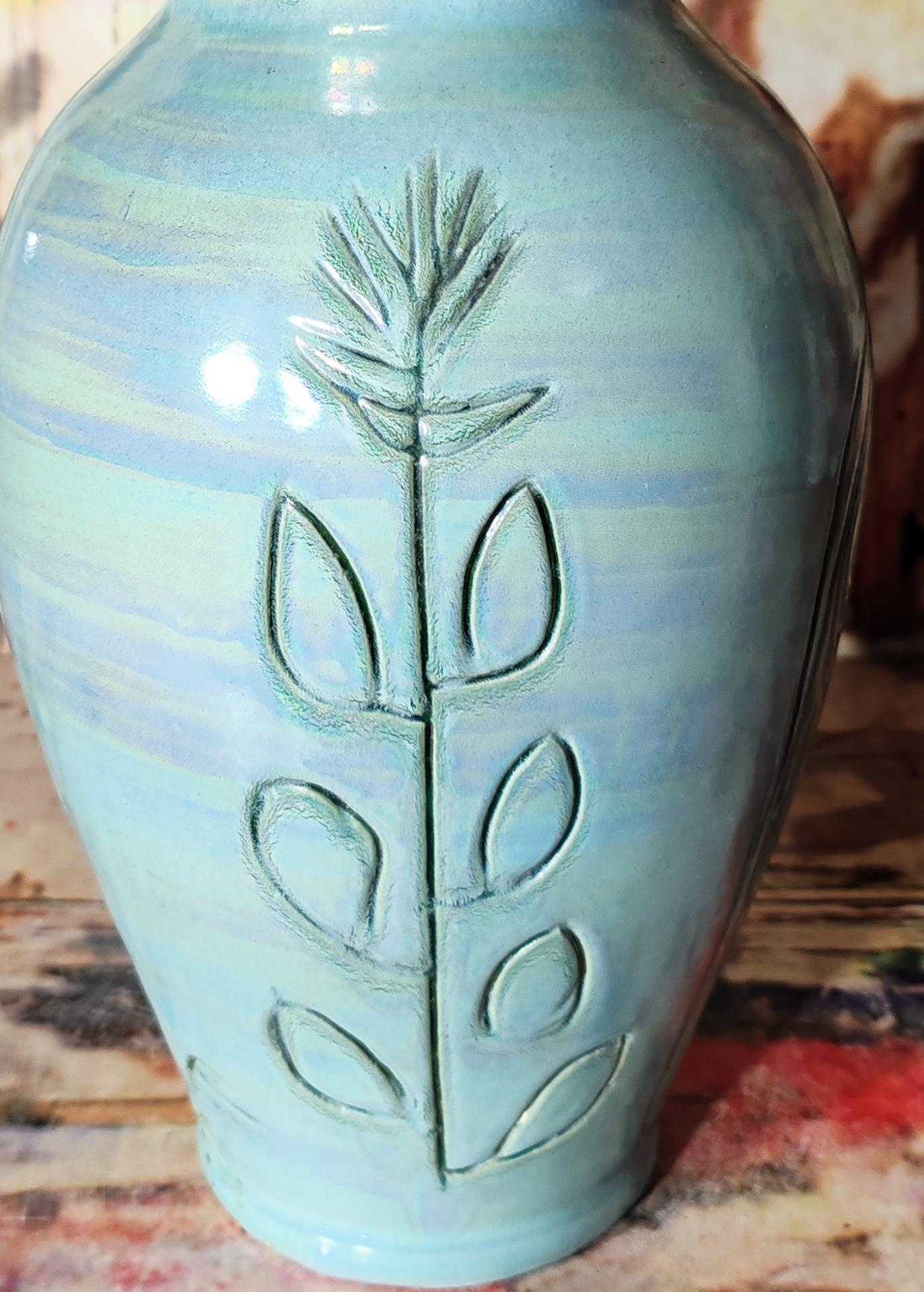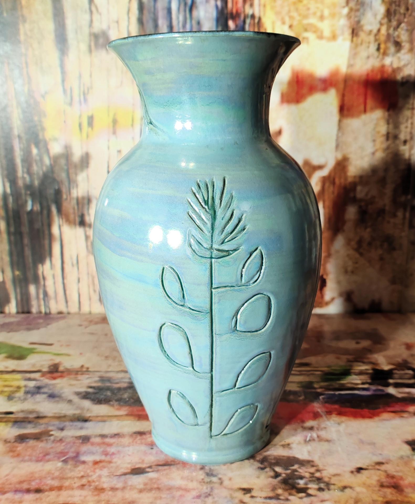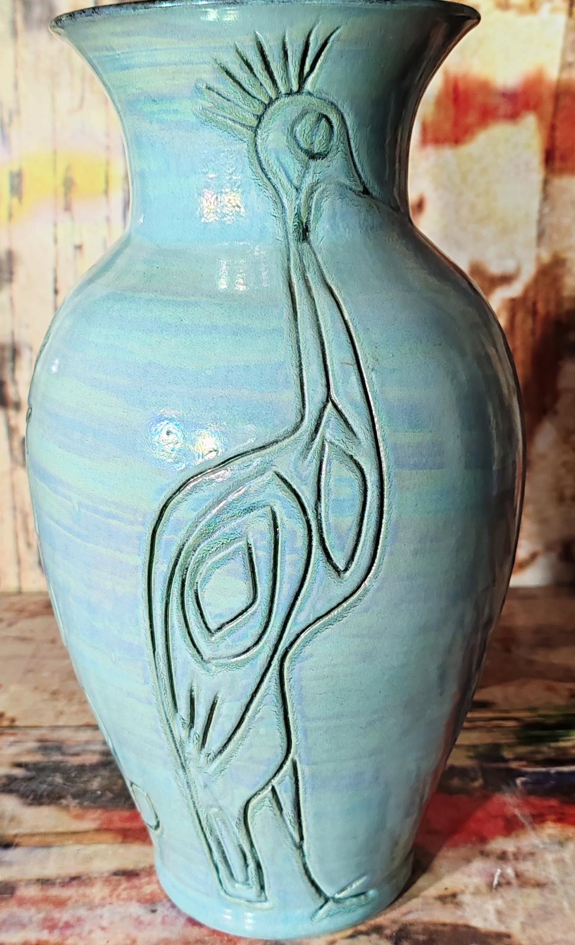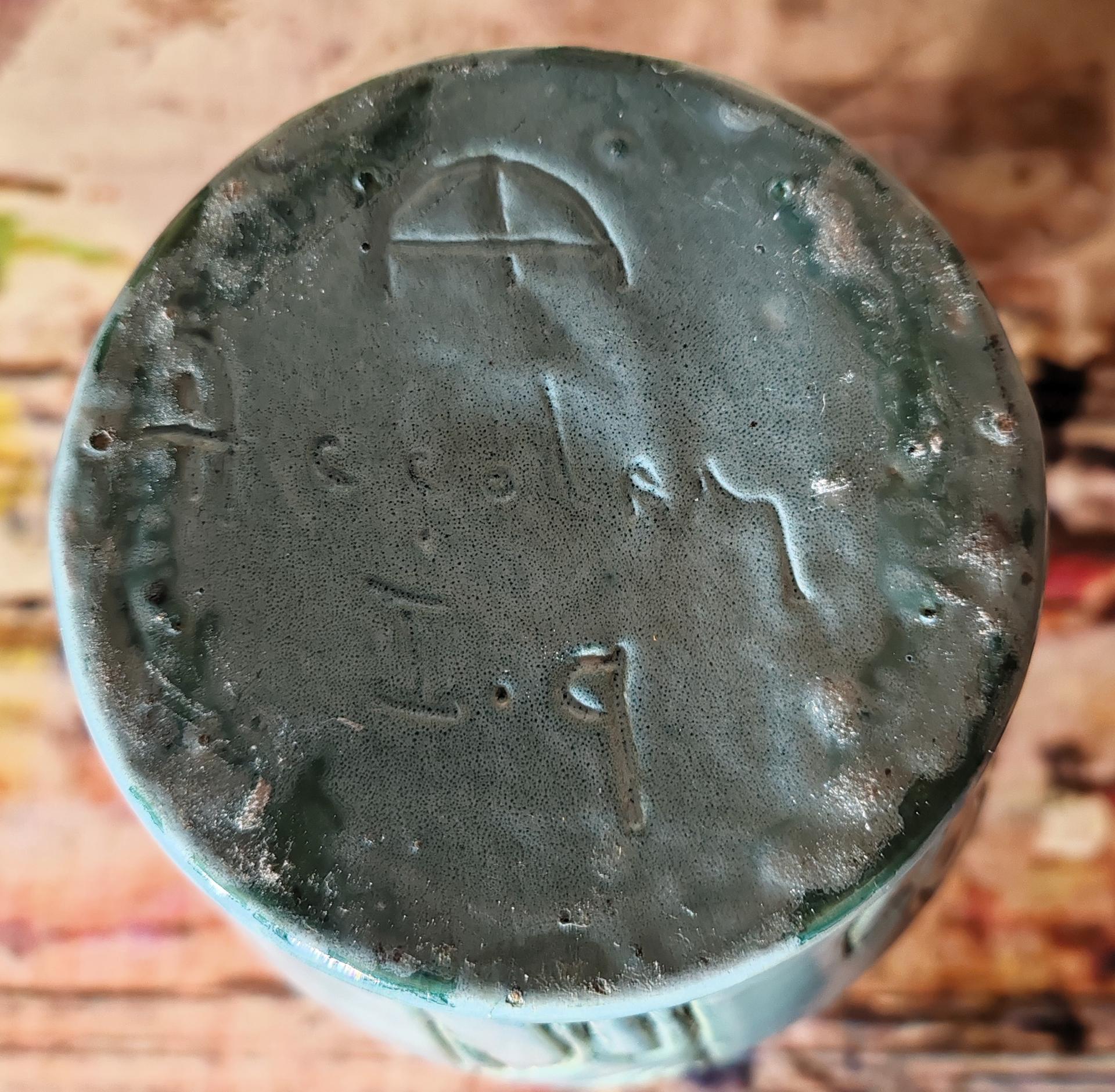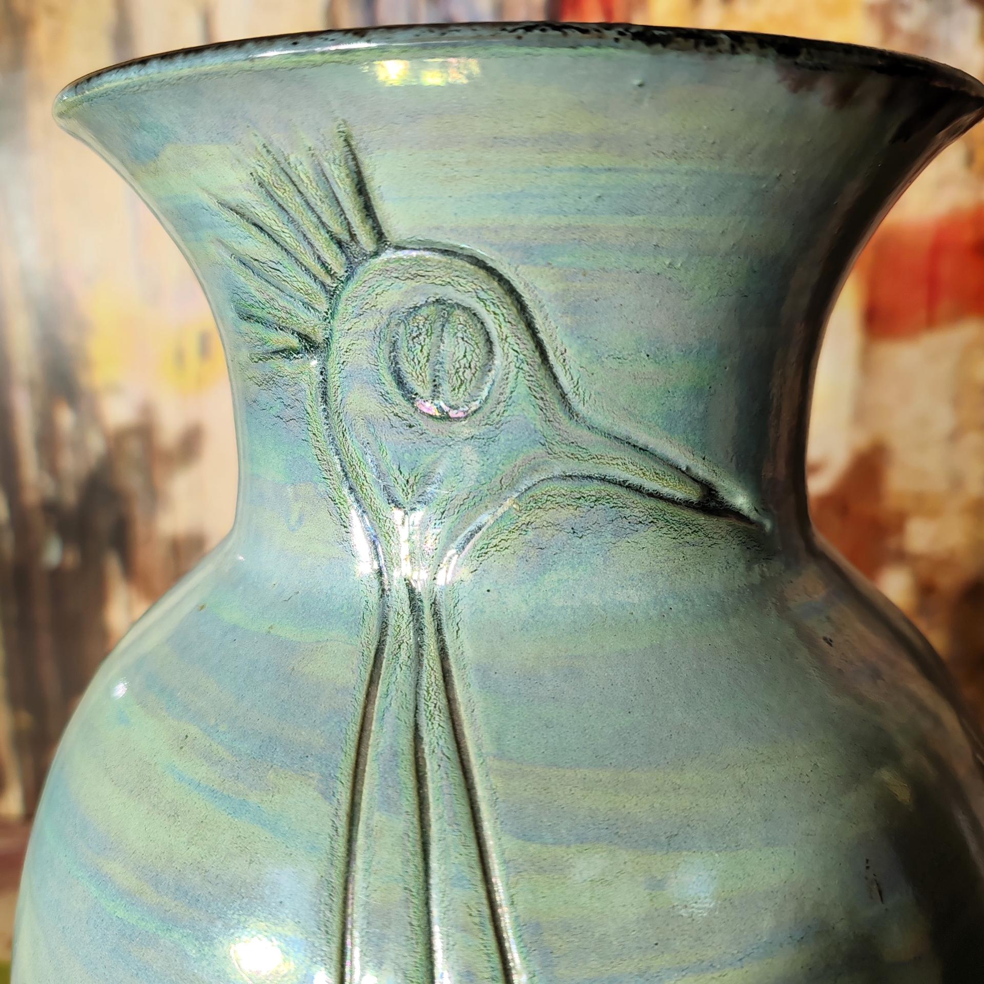 Beau et grand vase en faïence vernissée aux nuances  « turquoise » irisées, décor d’un oiseau stylisé, incisé, sur une face, et une fleur sur l’autre, signé, premiere production, signature du double A » et   » I Q – ACCOLAY « . Vase de forme balustre avec col resserré des années 50/60.