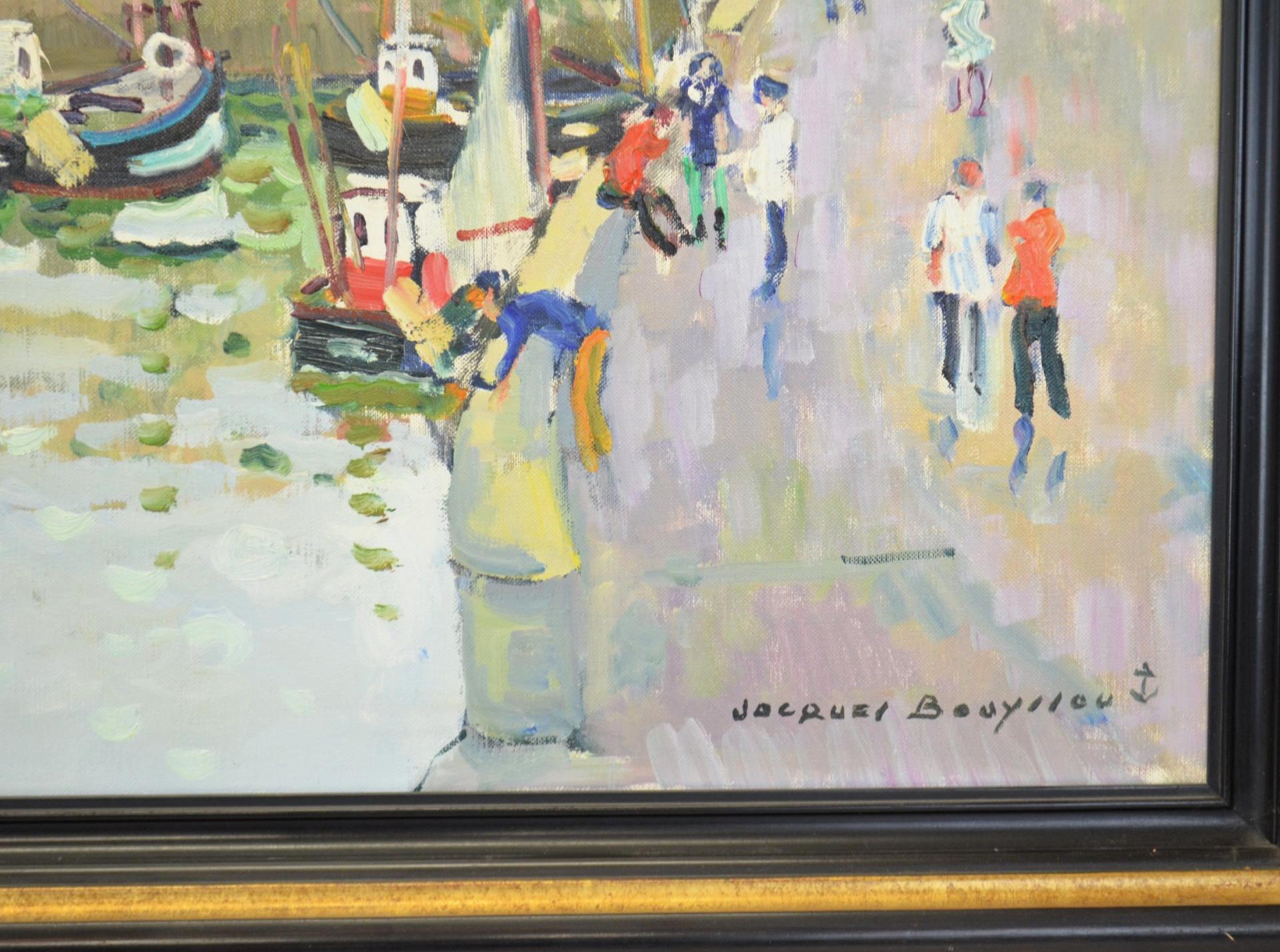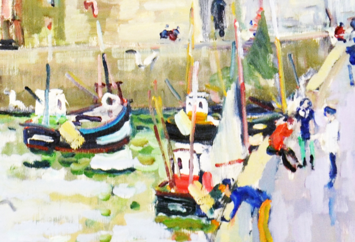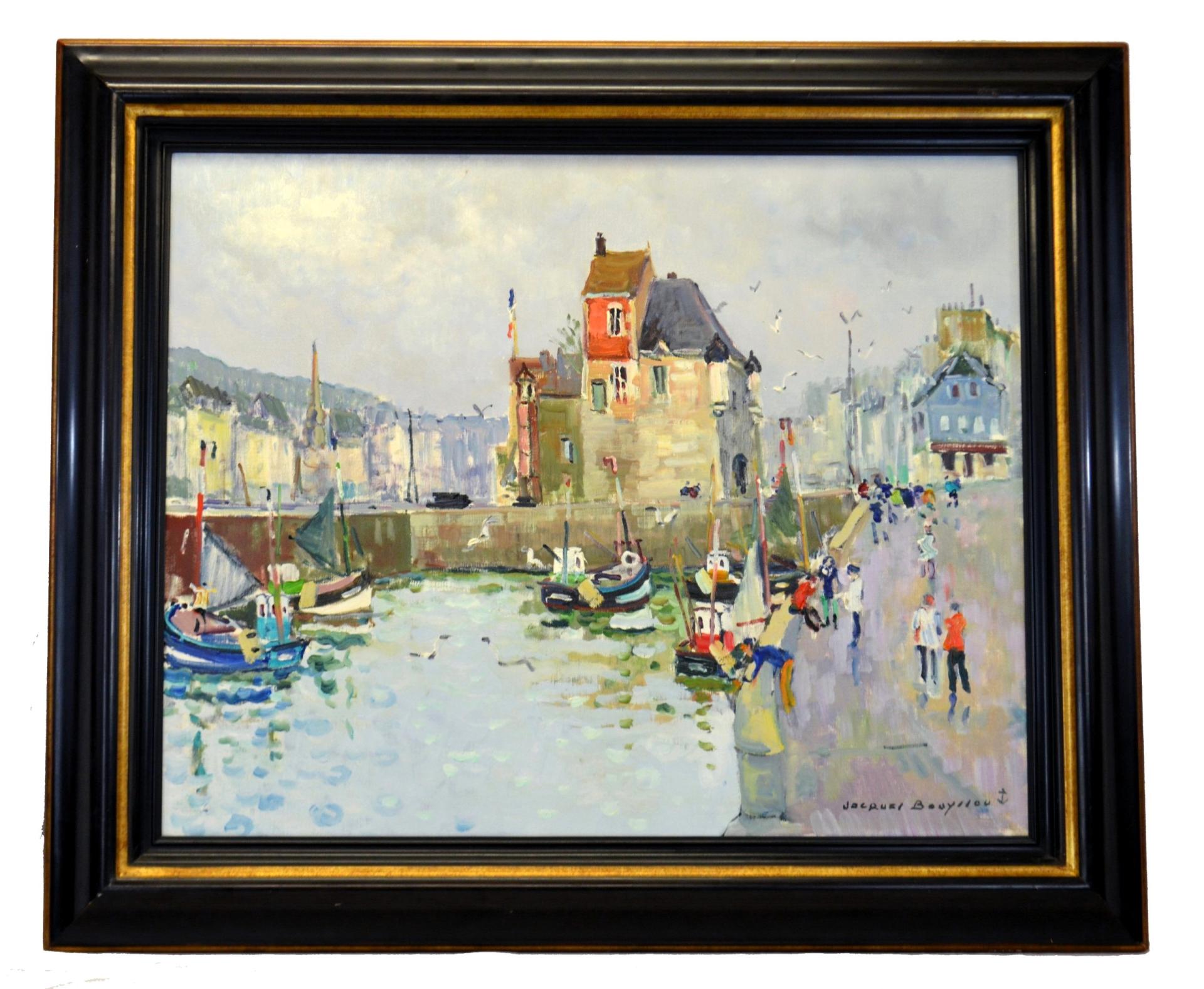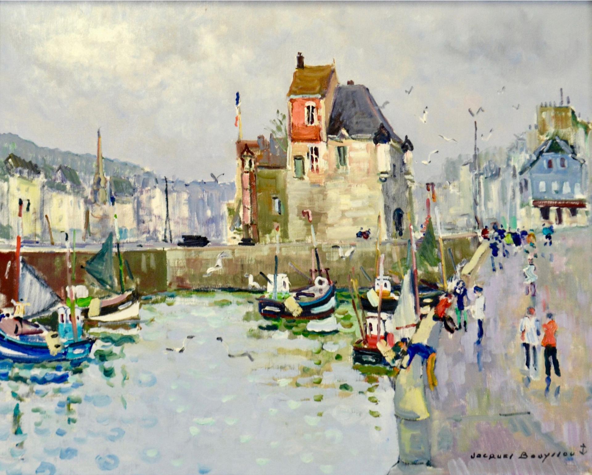 A very pretty painting by Jacques Bouyssou, representing La Lieutenance of the port of Honfleur, in Normandy, executed in a bright and colorful palette,