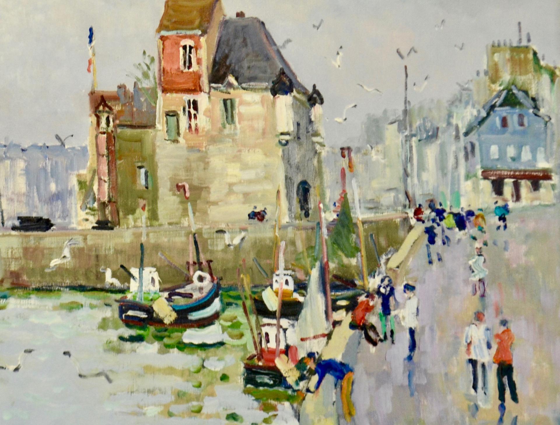 Un très joli tableau de Jacques Bouyssou, représentant La Lieutenance du port de Honfleur, en Normandie, exécuté dans une palette lumineuse et colorée,