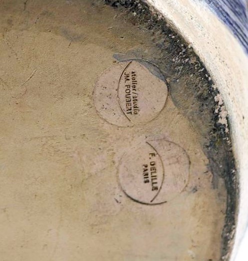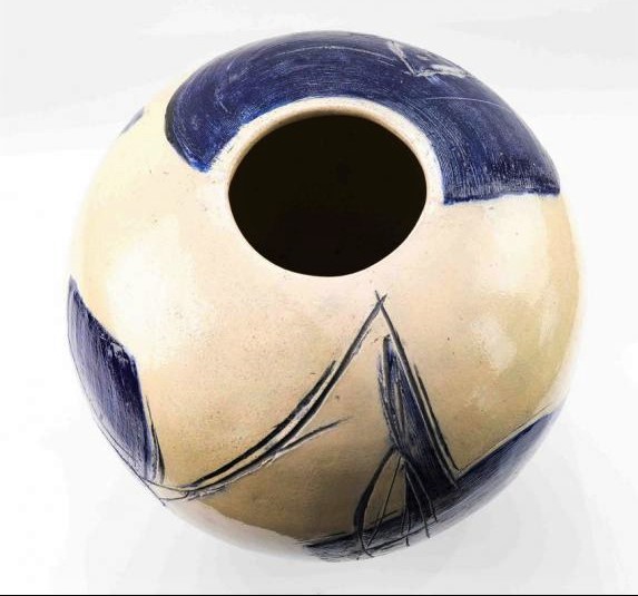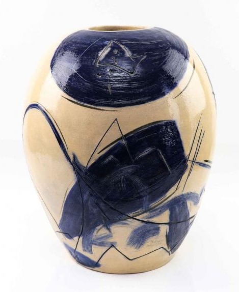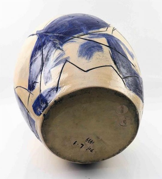 Magnificent and imposing enamelled ceramic pot Composition in blue on a cream background.