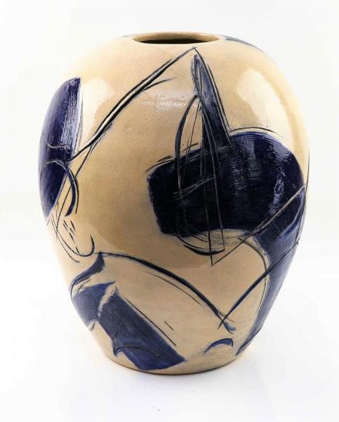 Magnifique et imposant pot en céramique émaillée Composition en bleu sur fond crème.