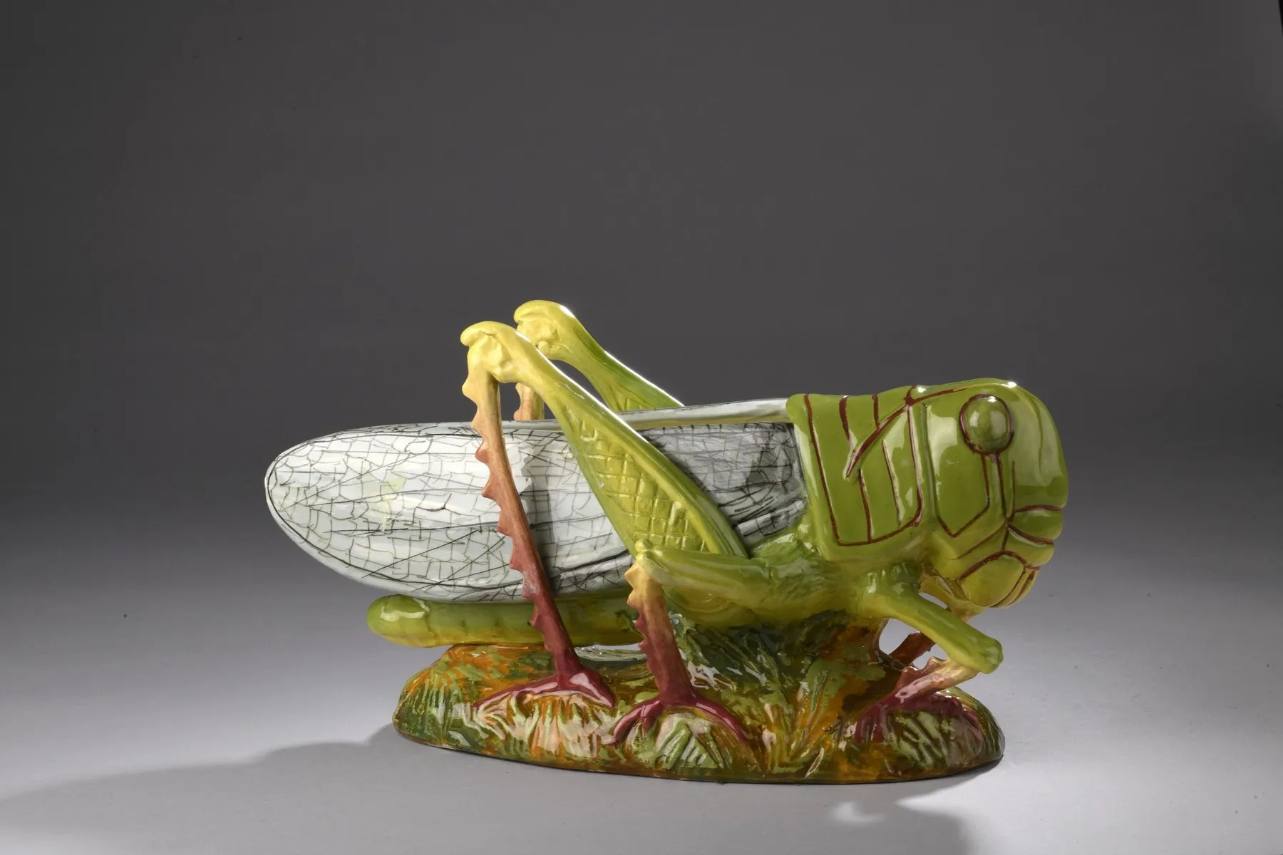 Imposante « Sauterelle », Jardinière en faïence en émaux polychromes . Signée  sous la base.