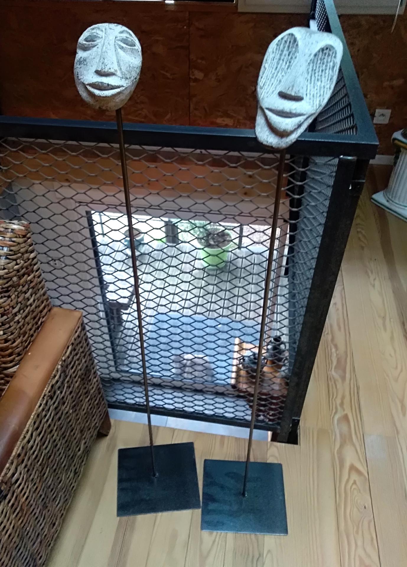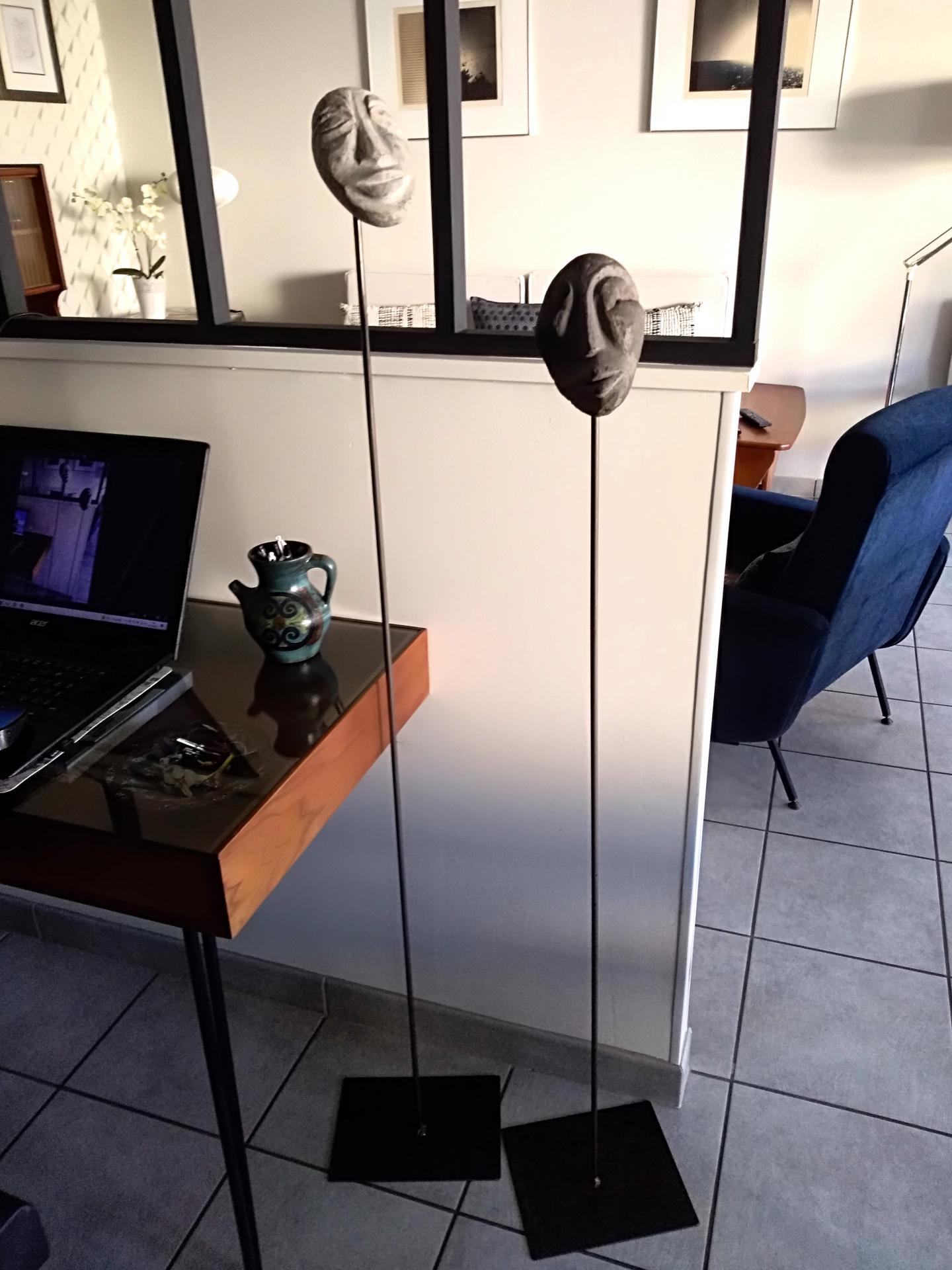 Sculptures fixées sur une tige métallique noire et socle métal noir.