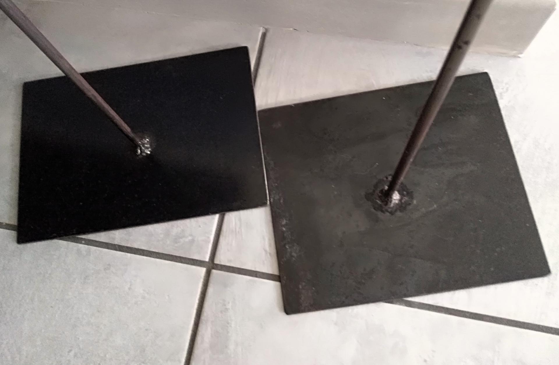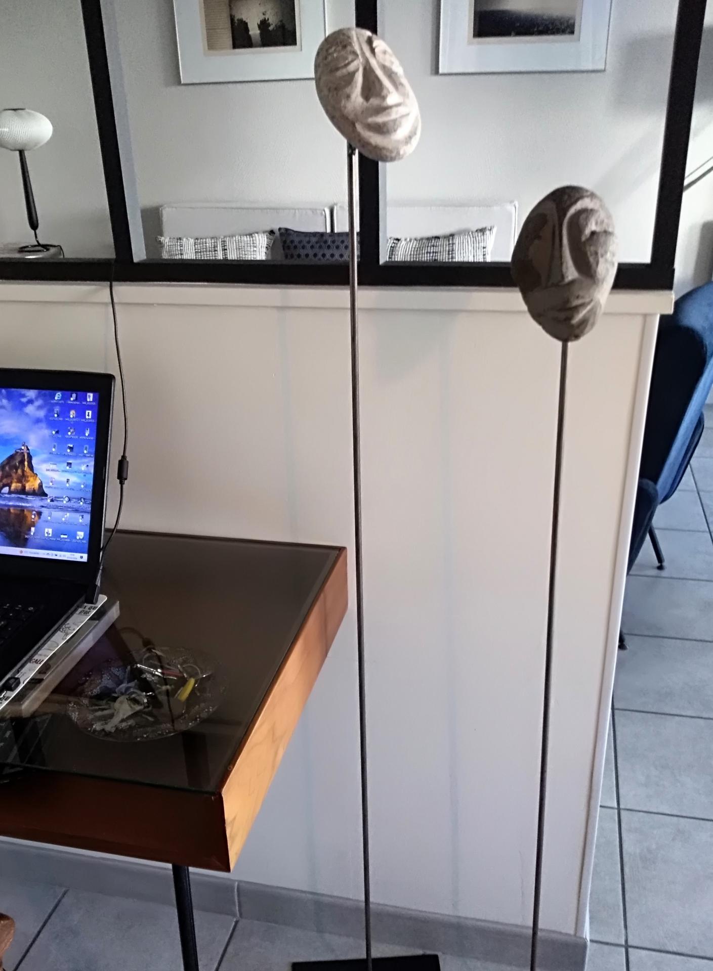 Sculpture fixée sur une tige métallique noire et socle métal noir.