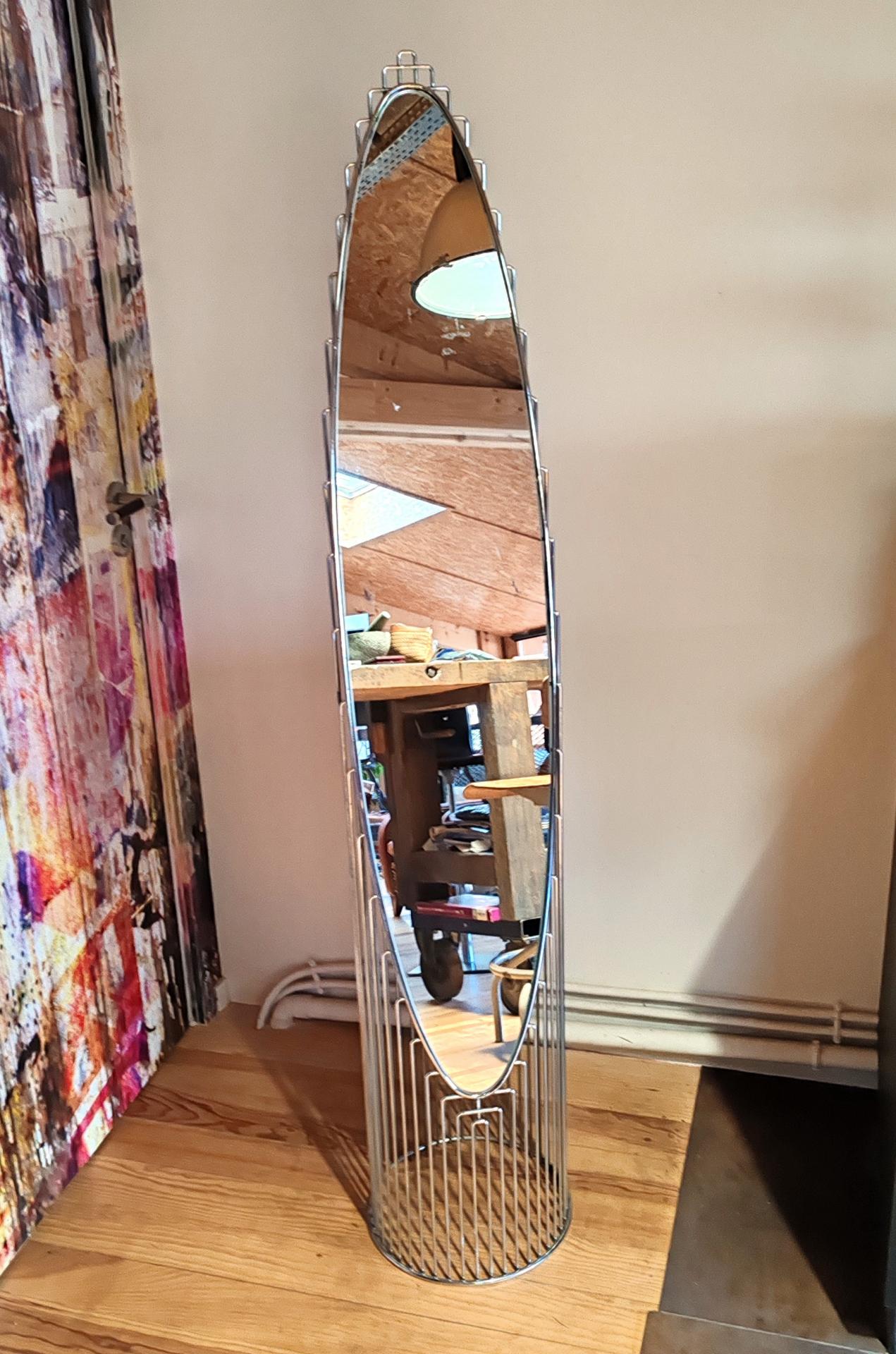 LECAL Roger, Grand miroir psyché en fils de métal chromé (modèle « Lipstick » ou rouge à lèvre). La base est de forme circulaire, conçu vers 1970.