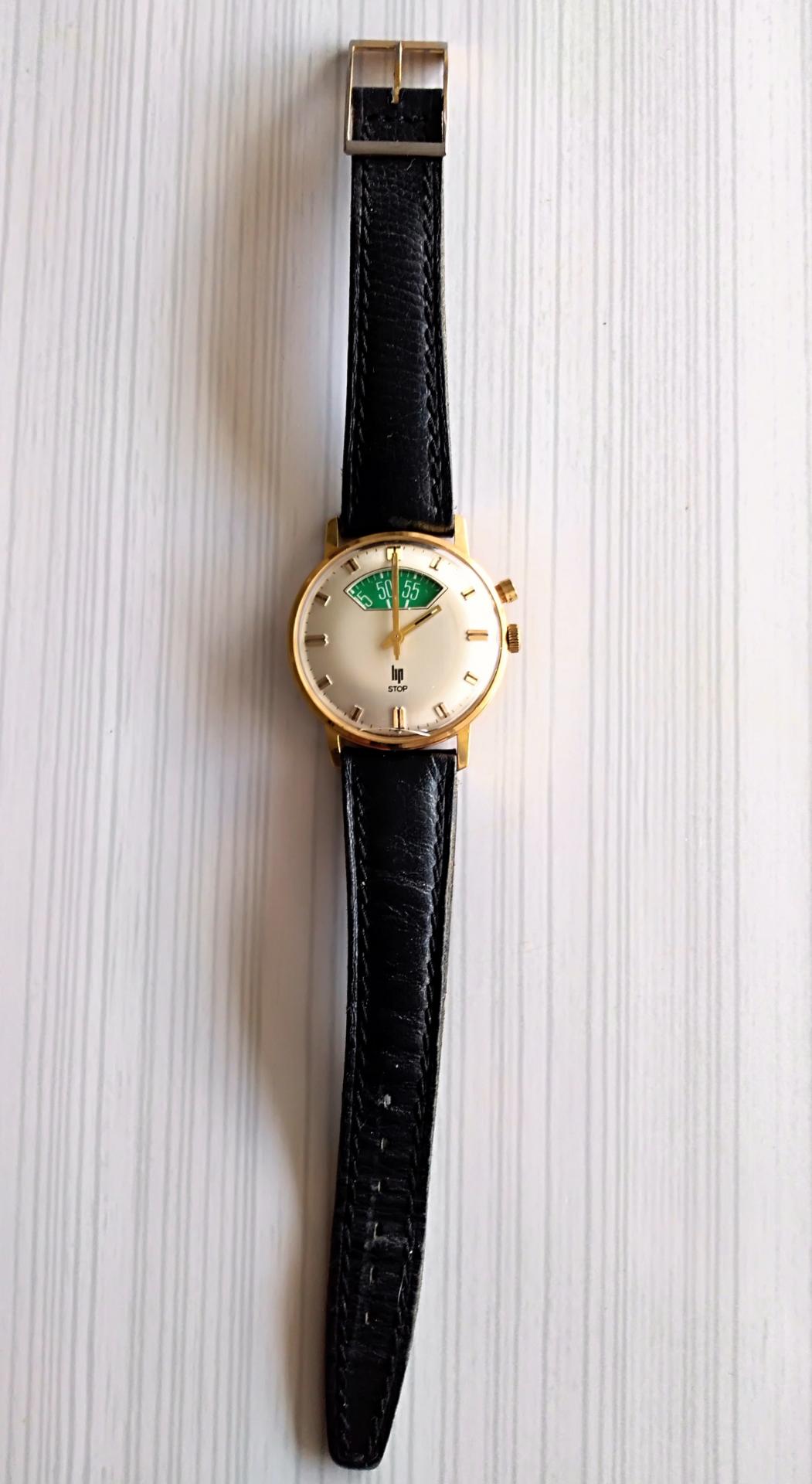 Cette montre n’a été produite qu’entre 1968 et 1971 ce qui en fait un objet assez rare, elle existe à la fois en boitier acier et en plaqué or et dont la couleur du disque peut être bleu, vert, rouge ou noir, le mouvement référencé chez Lip R 870 est un Durowé 471-4 qui laisse apparaître une couronne pour remonter la montre et un petit poussoir permettant à la fois de remettre le disque à zéro et également de l’enclencher.