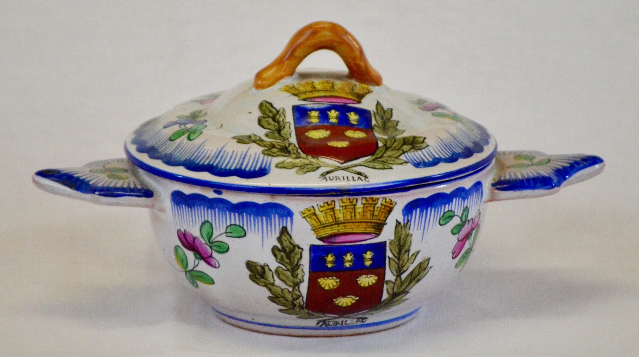 Still life with a vase of roses and a bowl engraved with the arms of the city of Aurillac. (Cantal)
