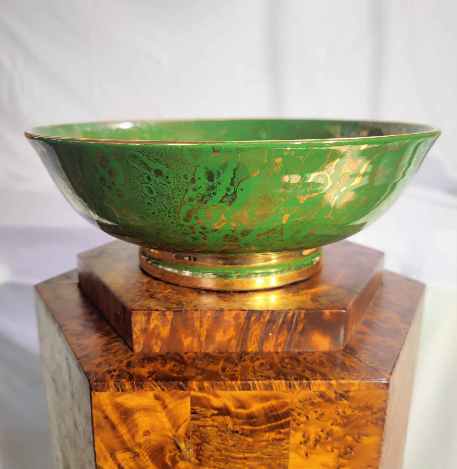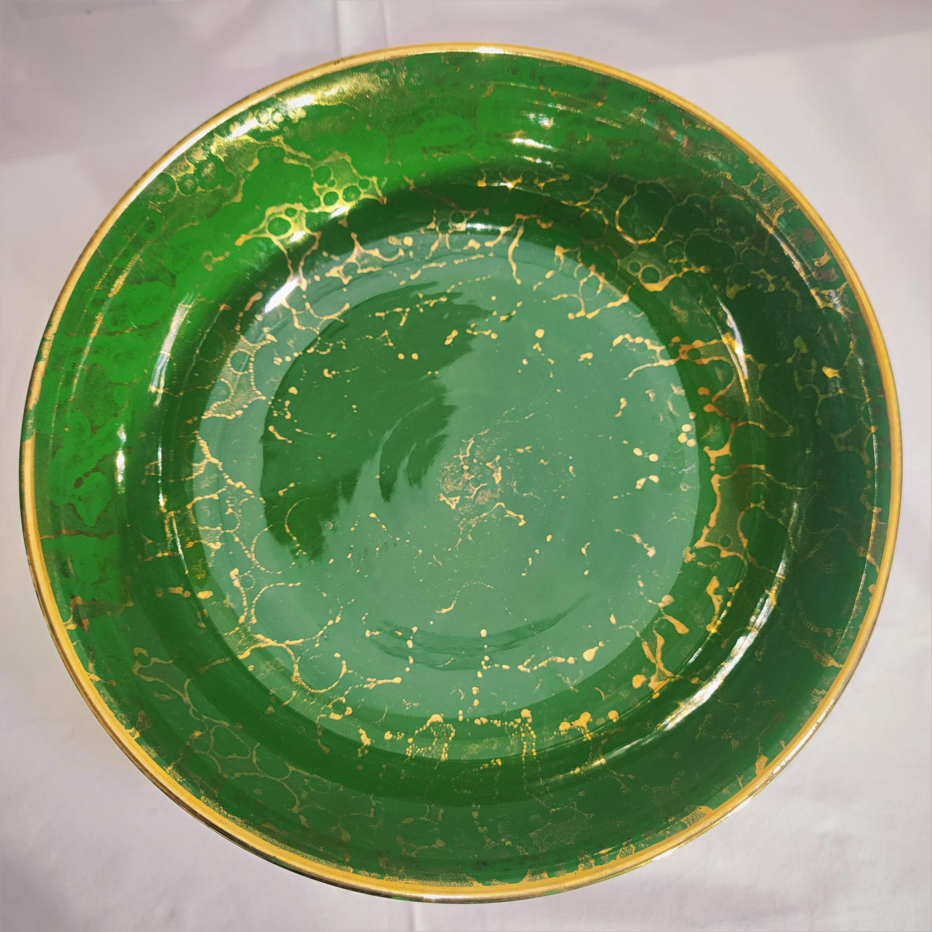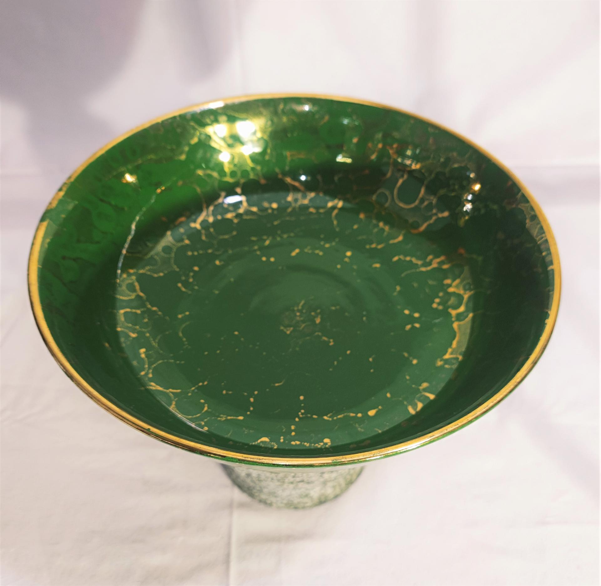 MAZEAUD and FAVEROT Cup on porcelain heel with gold speckled decoration, under cover of nuanced green crystallization with gold highlights, enamelled interior. Signed « Les Ateliers de Céramiques Sèvres fmf ». The lip and the foot of the cup are underlined by a golden border.