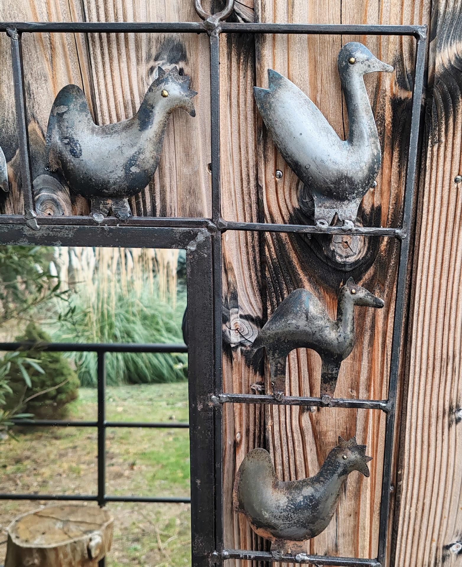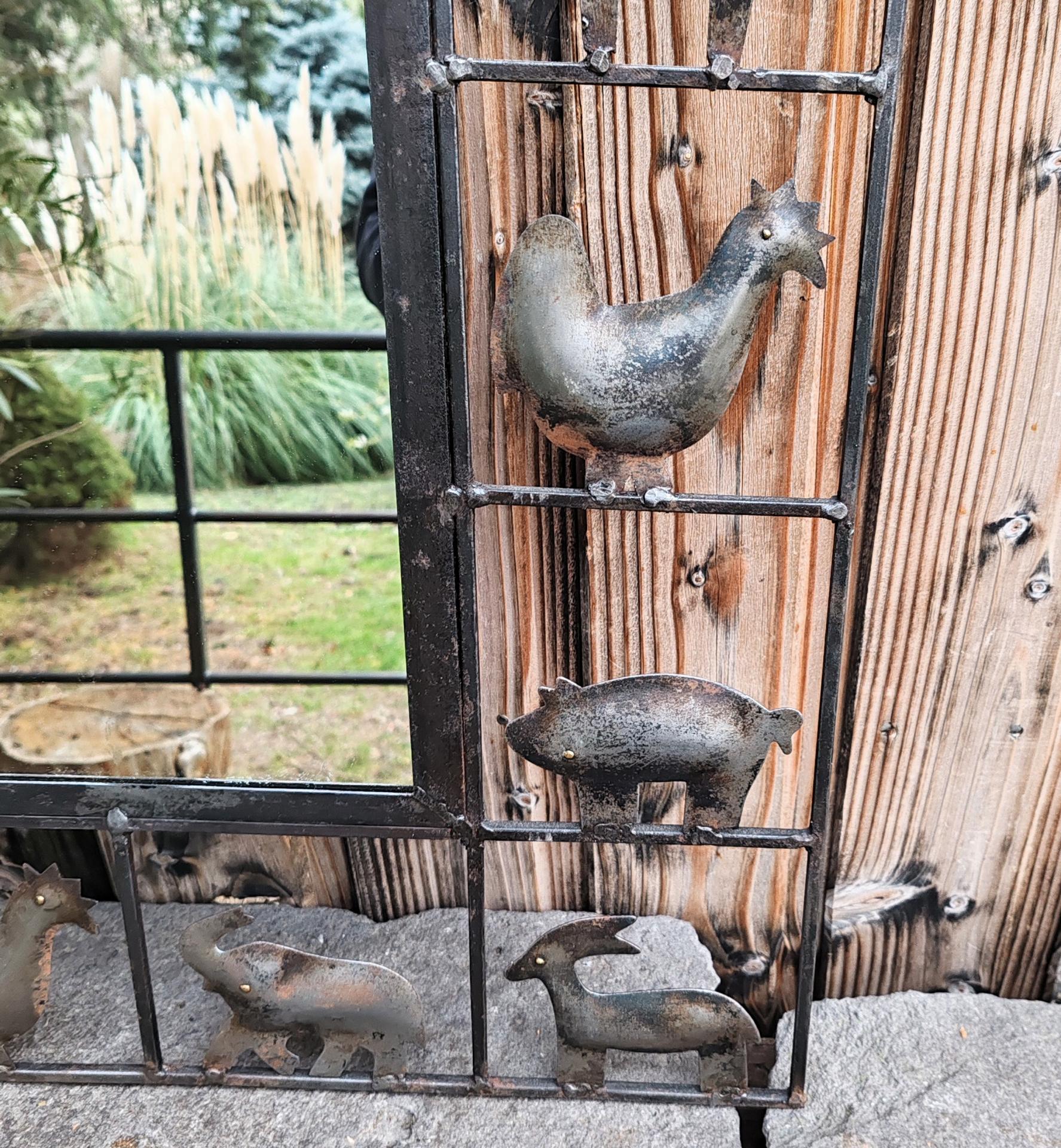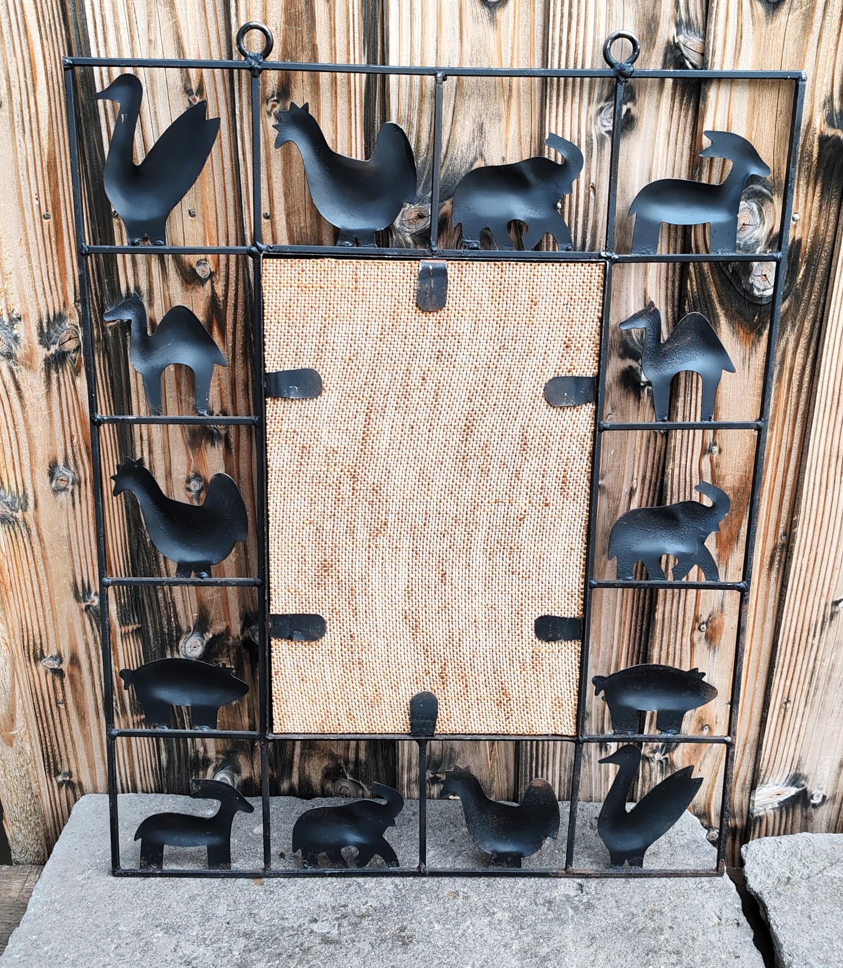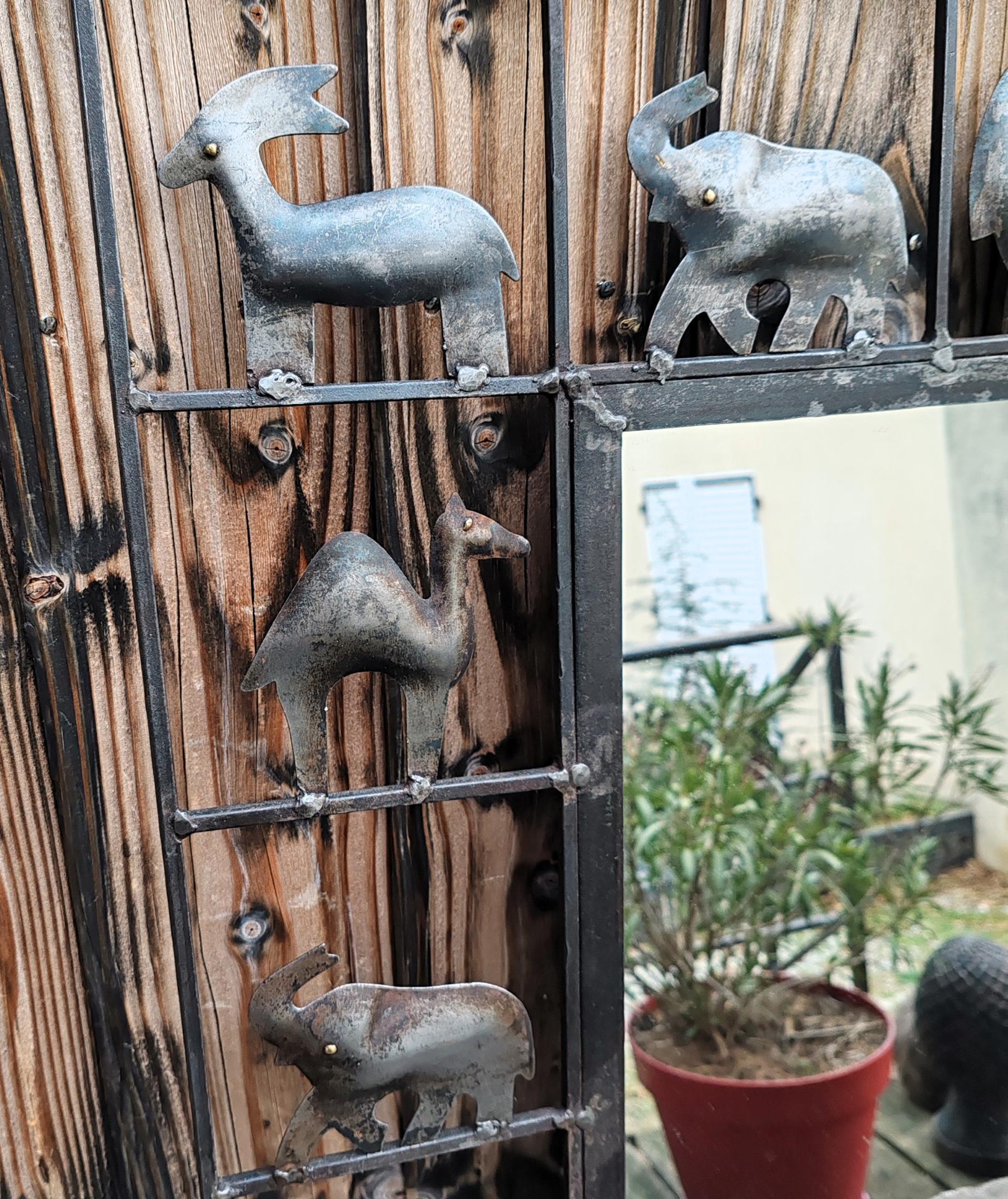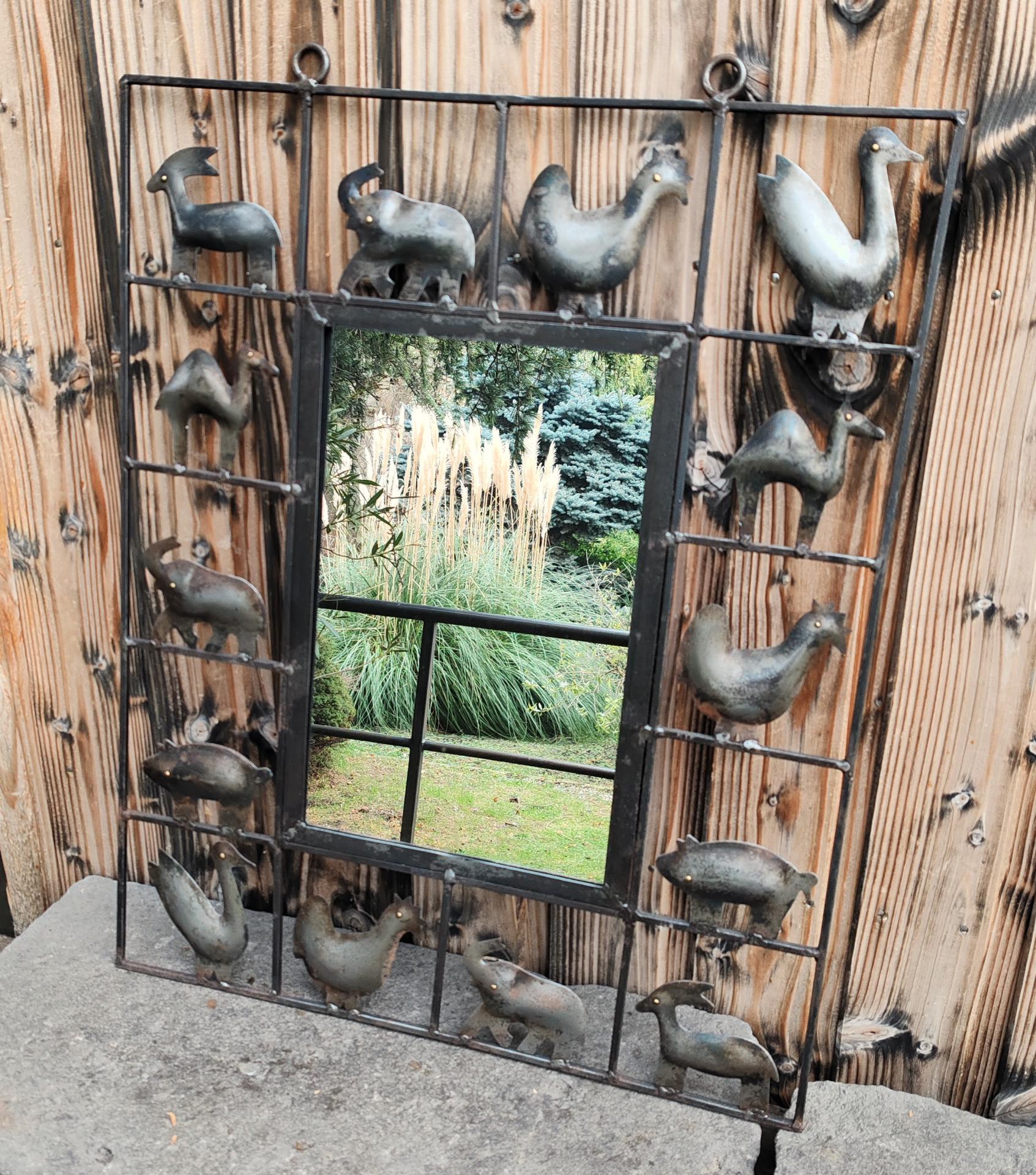 La finition en fer d’origine présente une belle patine d’ancienneté, miroir artisanal, de courants brutaliste et animalier, avec un encadrement métal dont les pièces martelées ont été soudées manuellement, représentant un magnifique et original bestaire, réhaut de métal doré signifiant les yeux des animaux.