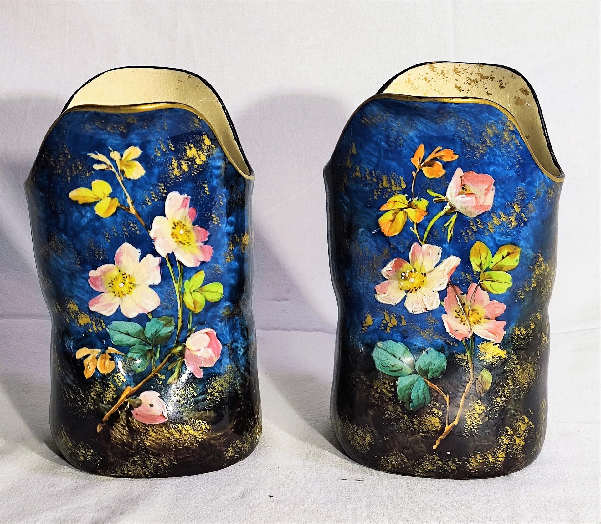 PAIR of VASES in earthenware or so-called impressionist enamelled ceramic with slip decoration of colored flowers on a blue background, neck underlined with a gold fillet, monogrammed HC under the base and embossed signature in the shape of a vase