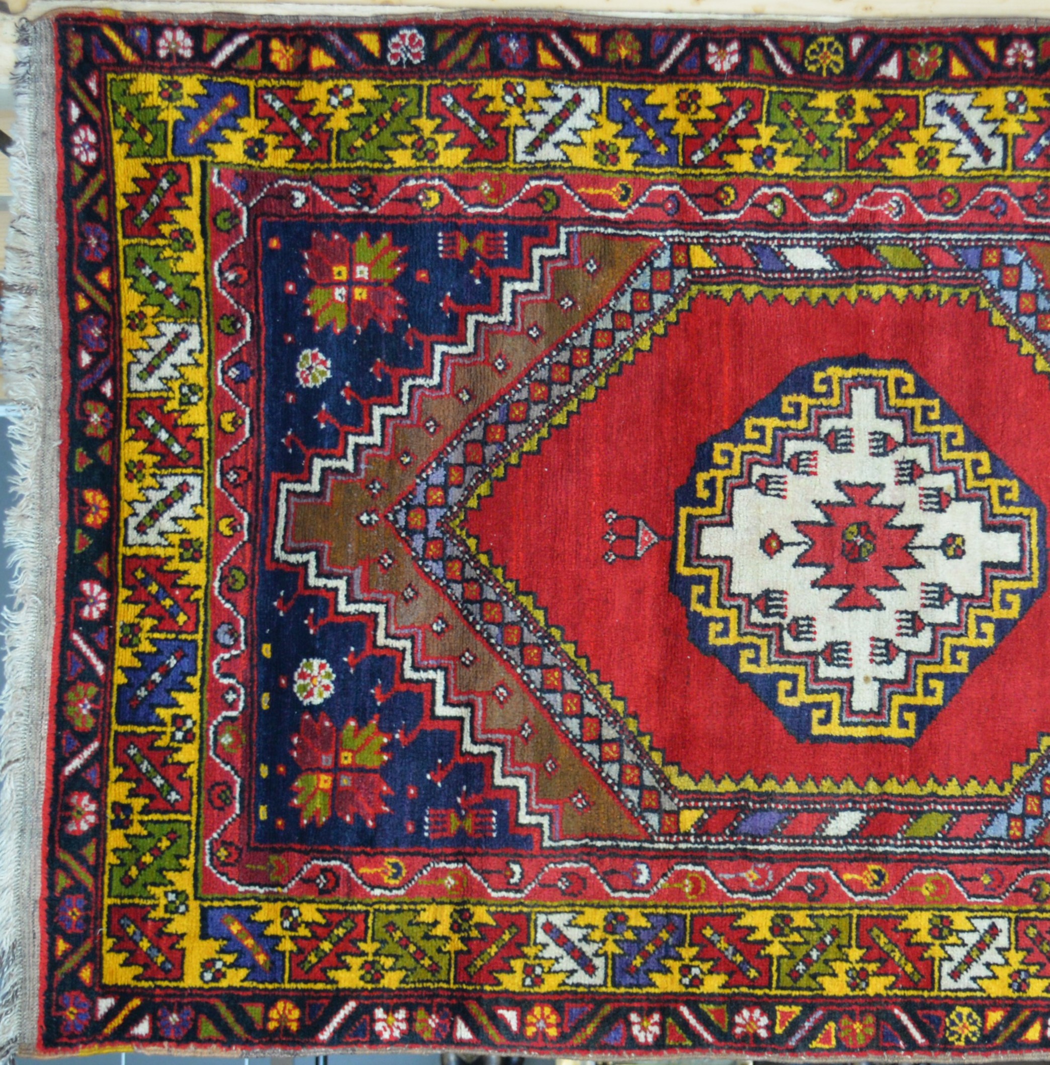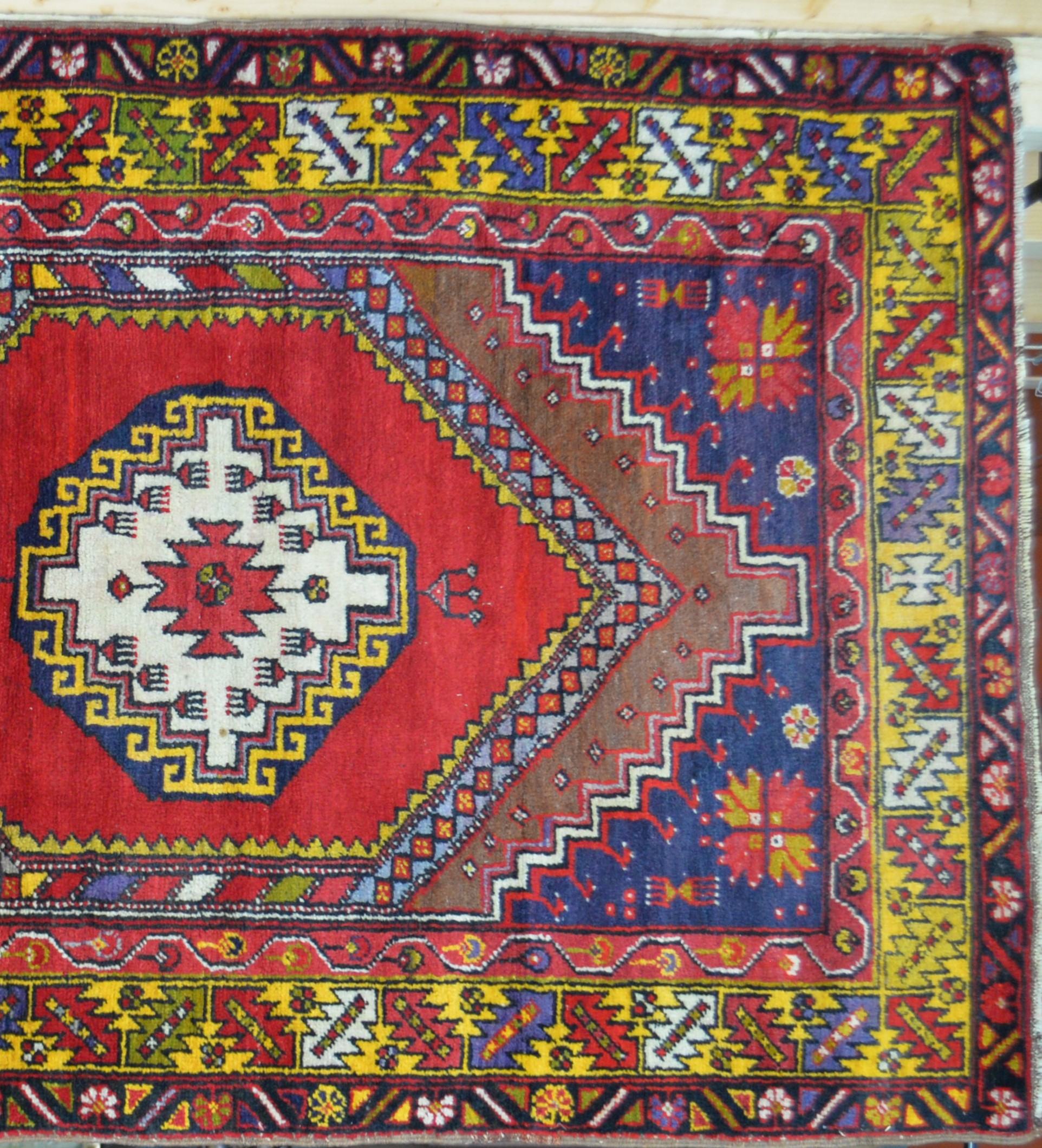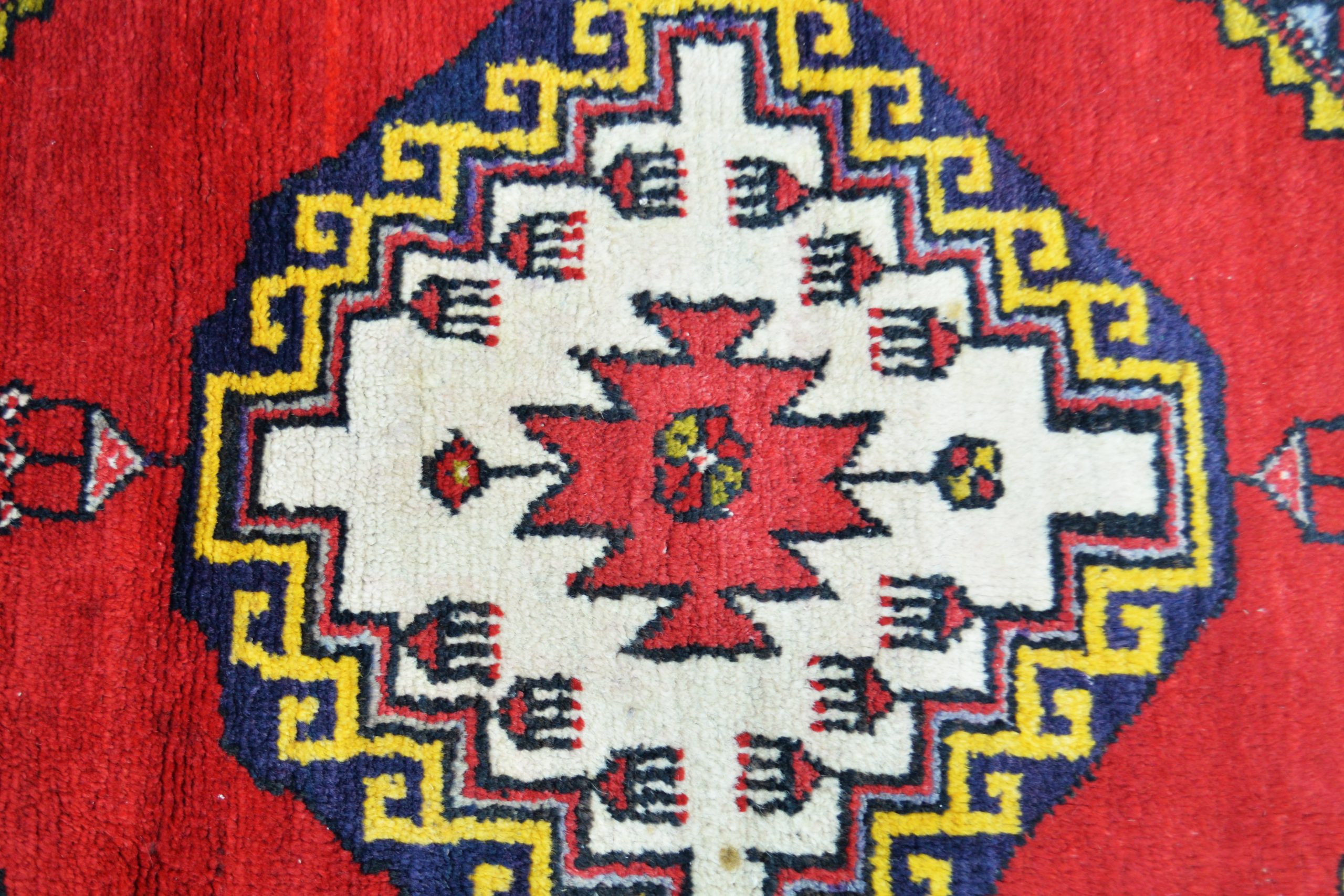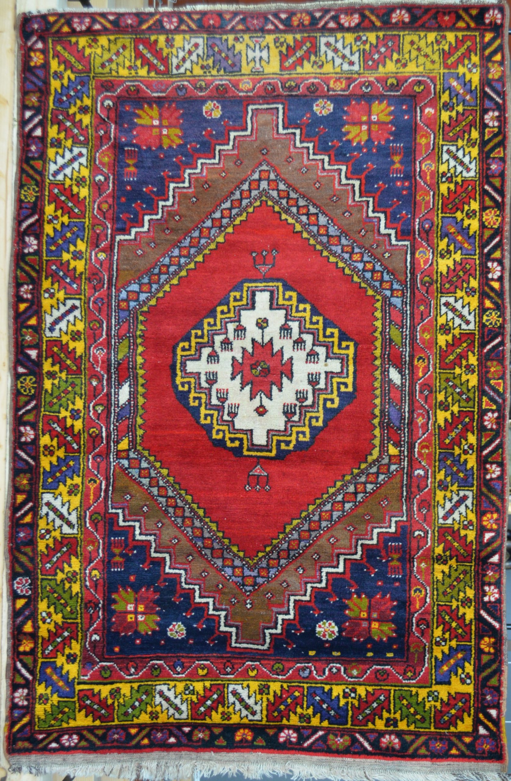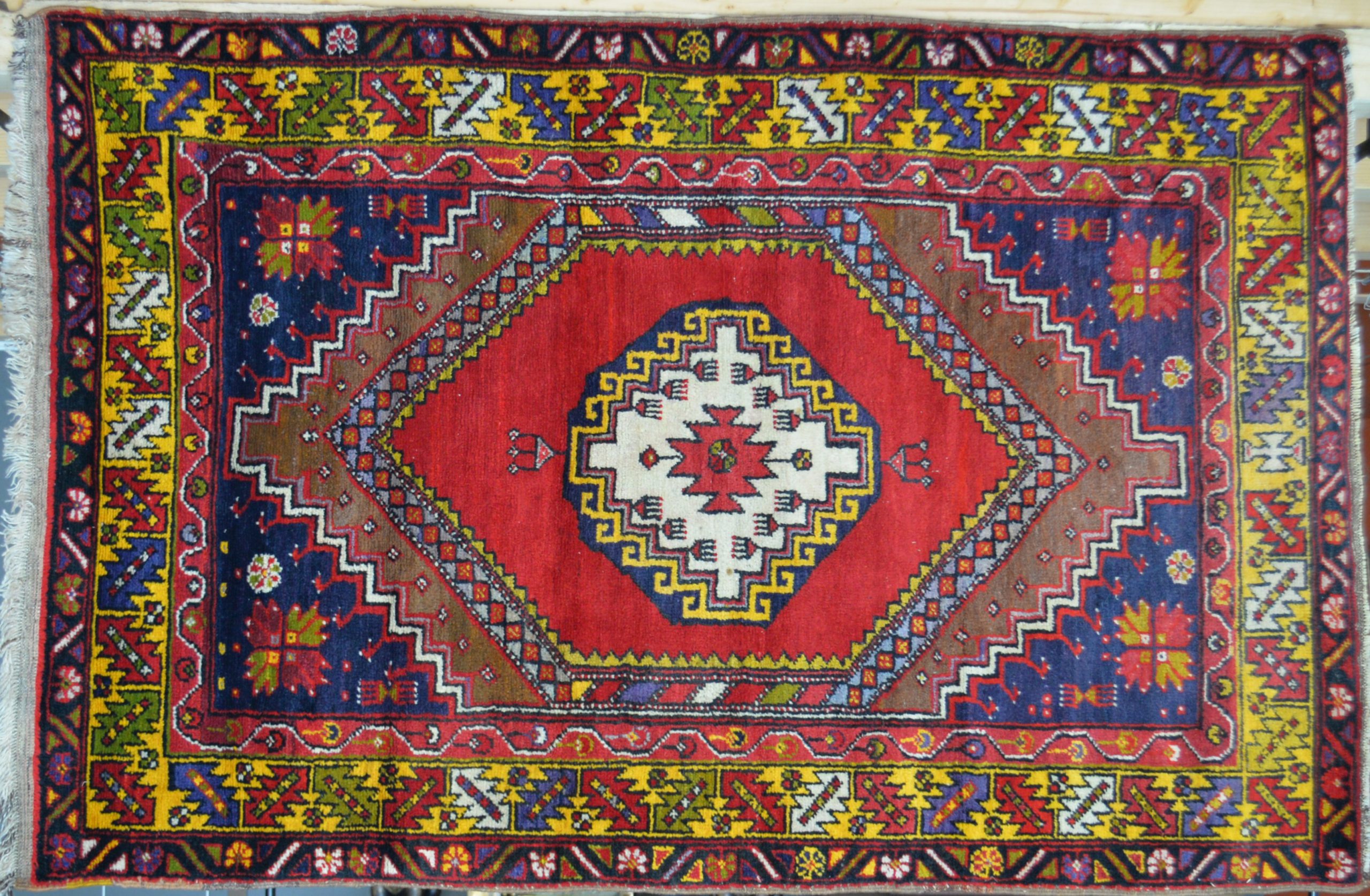 Ce tapis est orné d’un motif particulier, un losange sur fond rouge.